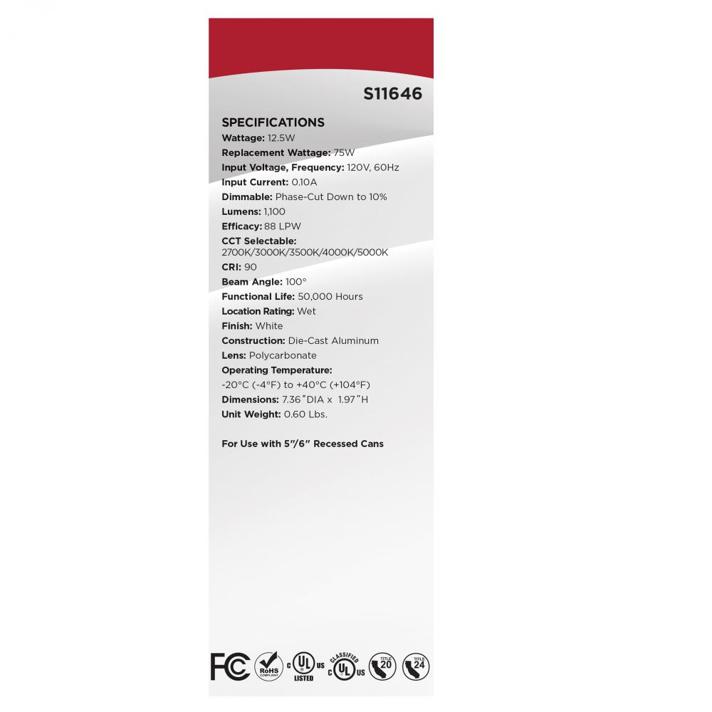 12.5 Watt LED High Lumen Downlight Retrofit; 5-6 Inch; 27K/30K/35K/40K/50K CCT Selectable; 120