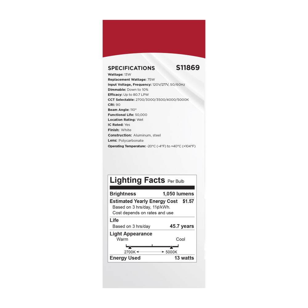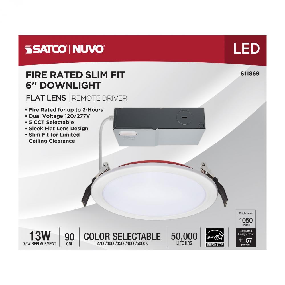 13 Watt LED; Fire Rated 6 Inch; Direct Wire Downlight; Round Shape; White Finish; CCT Selectable; 120-277 Volts; Dimmable