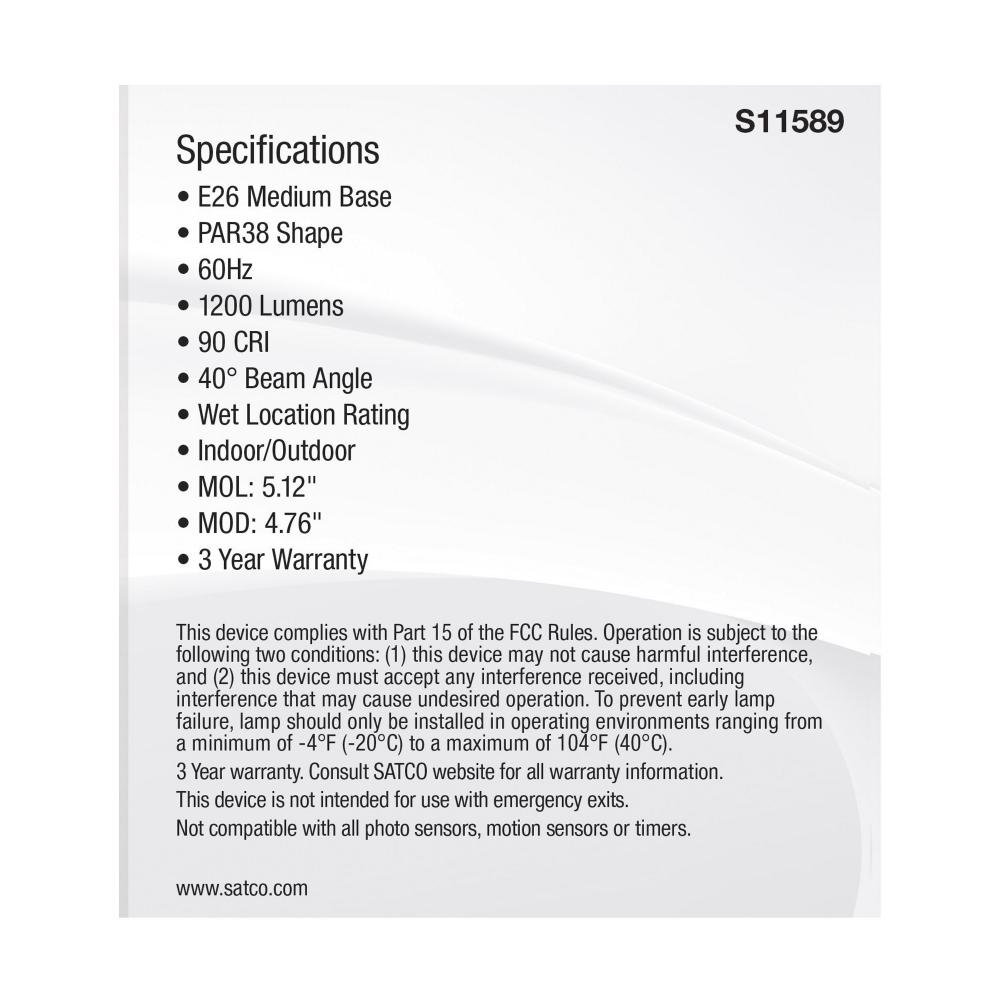 SATCO NUVO's LED S11589 PAR Lamp is the perfect solution for recessed and flood lighting. The PAR38 40 degree beam angle offers the best illumination for your application. Features a unique dial for the choice between 2700K/3000K/3500K/4000K/5000K colo