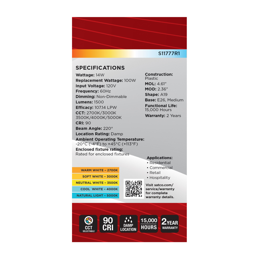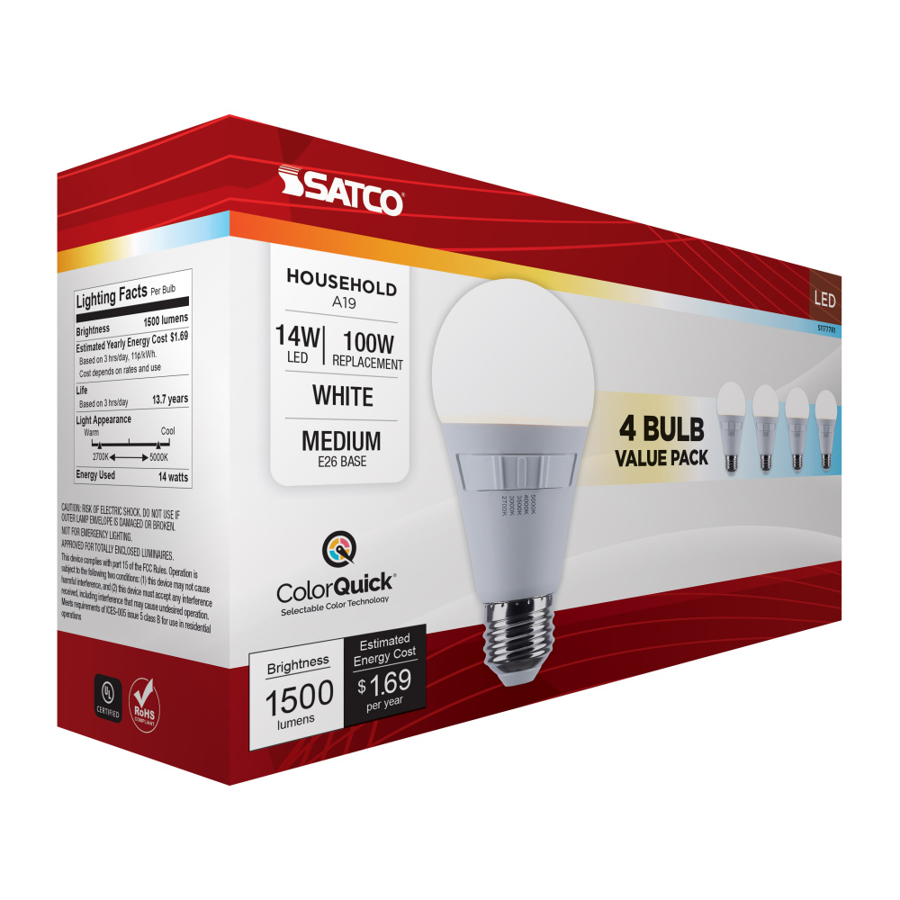 Elevate your everyday lighting with SATCO NUVO's S11777R1 14W LED A19 bulb-designed for flexibility, clarity, and dependable performance. Sold in a convenient, money-saving 4-pack, this bulb offers 5 CCT selectable options from a cozy 2700K to a vibran