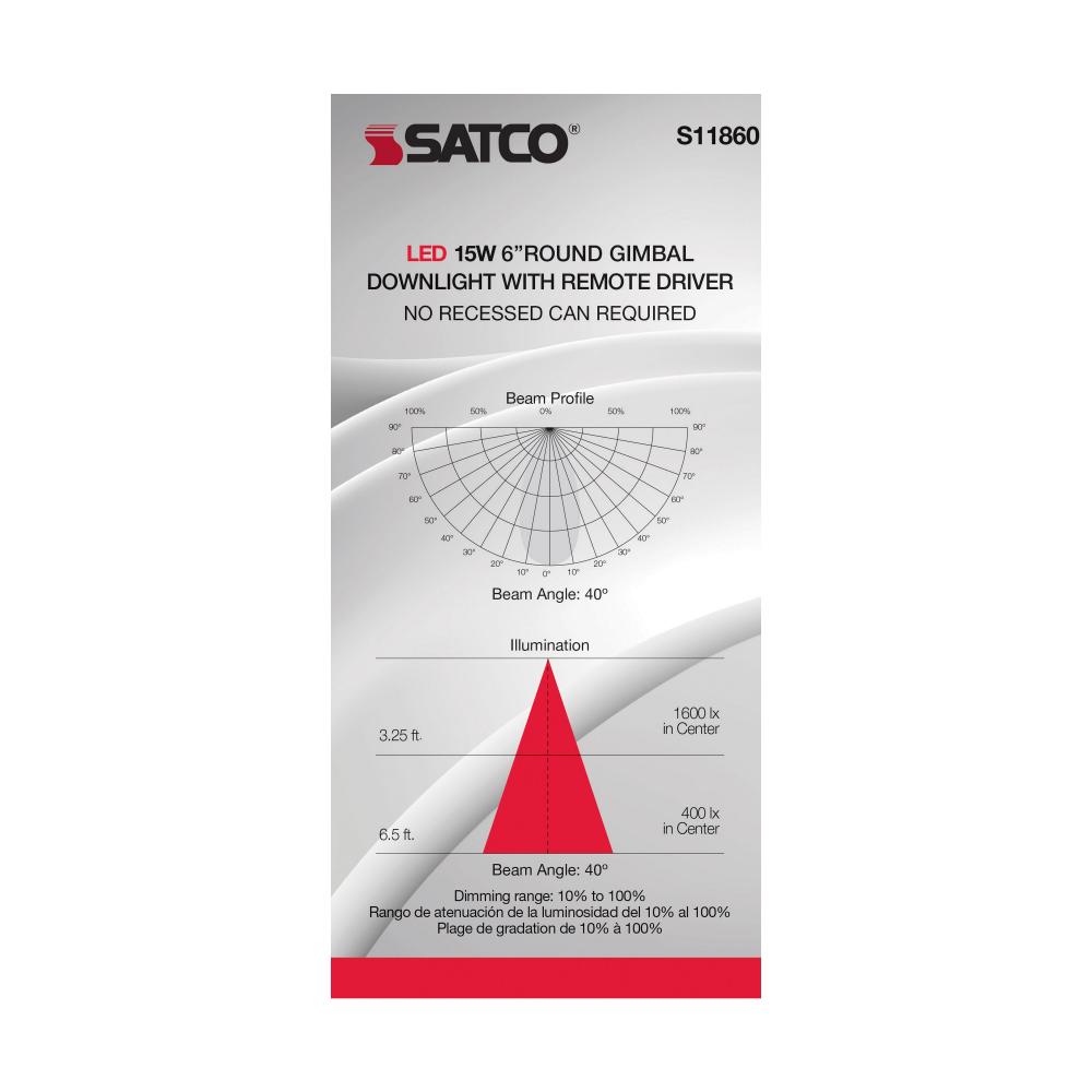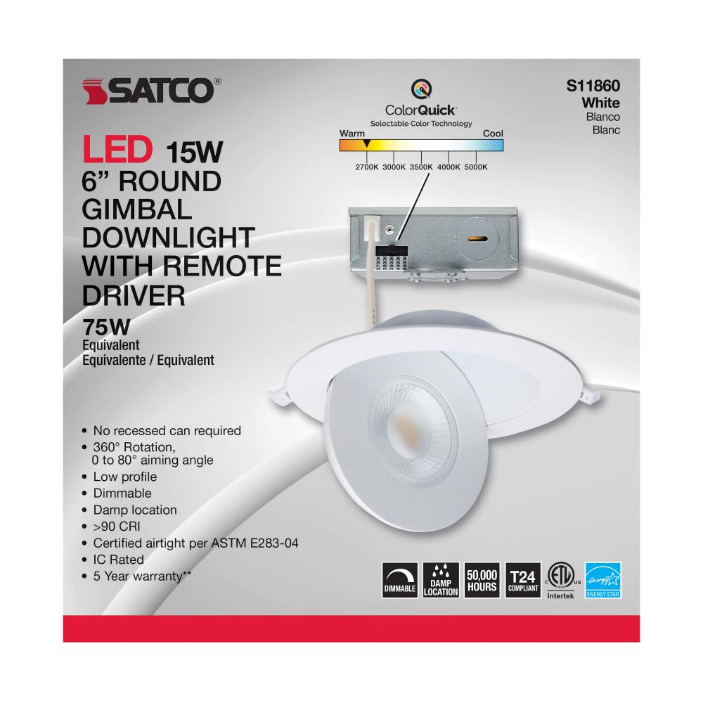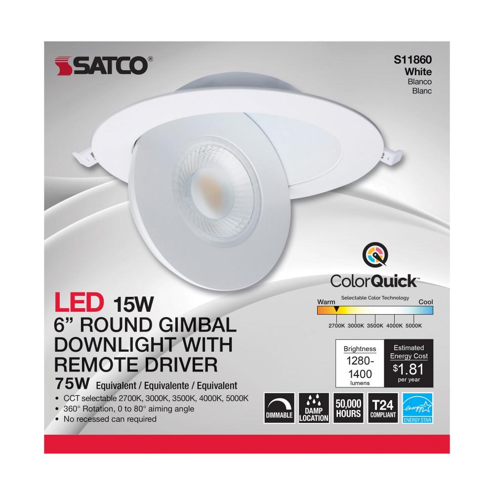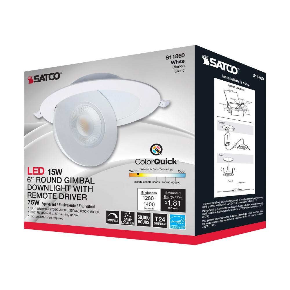 15 Watt; CCT Selectable; LED Direct Wire Downlight; Gimbaled; 6 Inch Round; Remote Driver; White by Satco Products Inc.