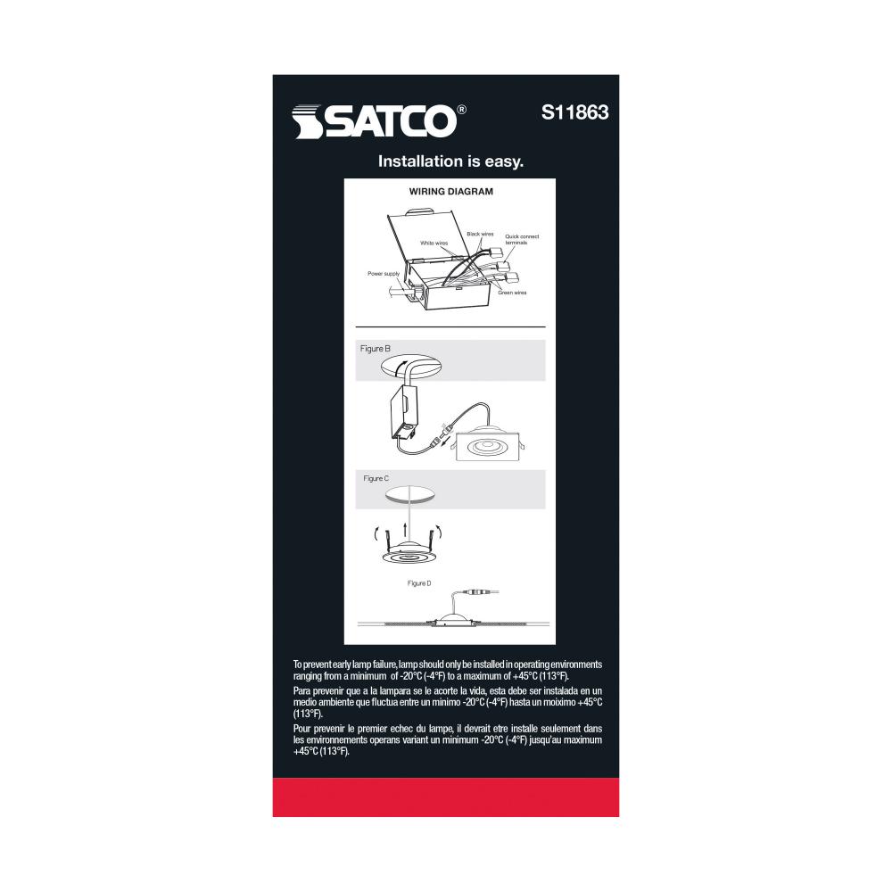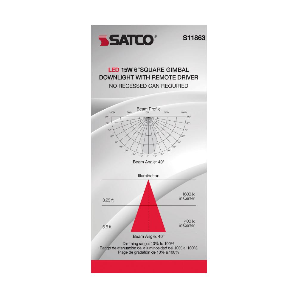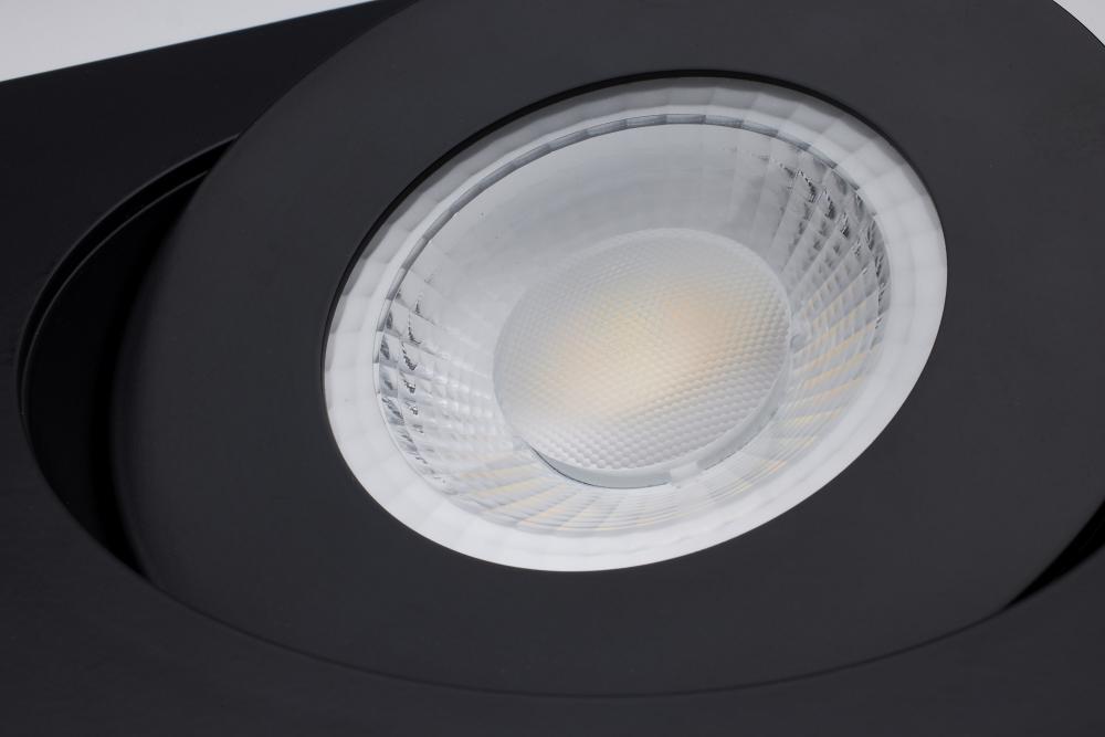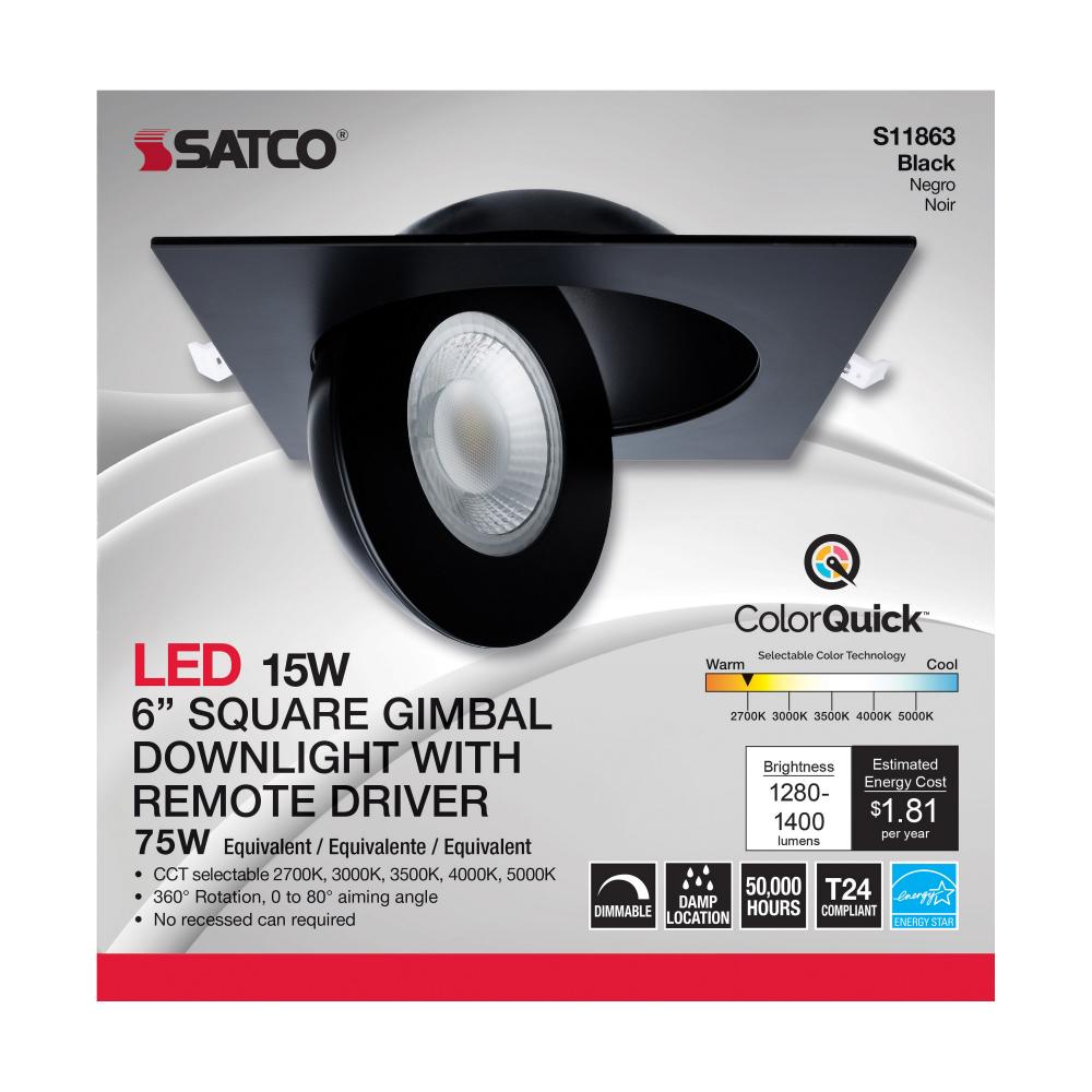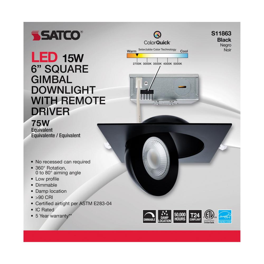 The black, six inch square, Satco S11863 gimbaled downlight delivers multiple advantages to any general recessed lighting project. Our ColorQuick technology allows the user to choose the color temperature from five different settings and brings the perfect