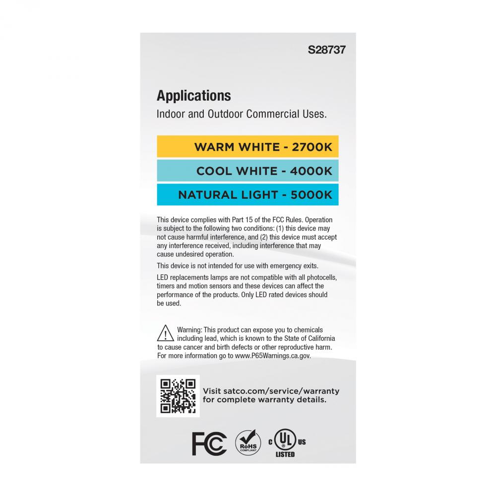 SATCO NUVO's S28737 LED Hi-Pro A21 20W Lamp offers ColorQuick convenience ideal for commercial projects. Choose from 2700K/4000K/5000K color temperatures at installation to achieve the desired atmosphere for the environment. Designed to work in 120V to