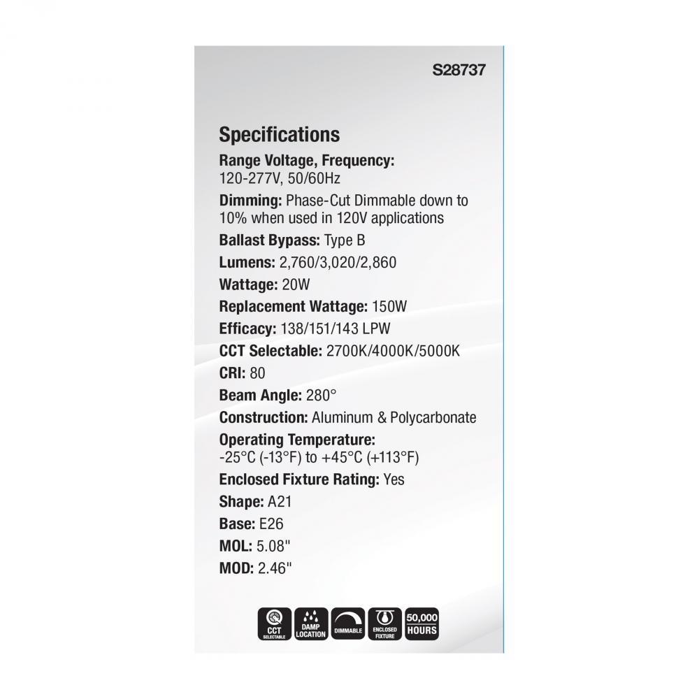 20 Watt LED A21; High Lumen Output; 27K/40K/50K CCT Selectable; Medium Base; White Finish; 120V-277V