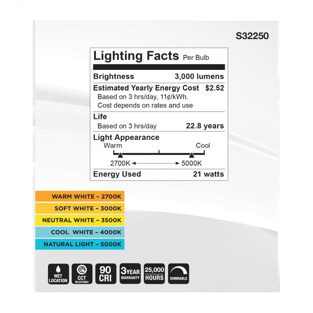 SATCO NUVO's S32250 High Lumen, CCT Selectable PAR38 lamp is designed for diverse indoor and outdoor applications. With crisp, 90 CRI light output choose between 2700K/3000K/3500K/4000K/5000K color temperatures at installation to create the perfect atm