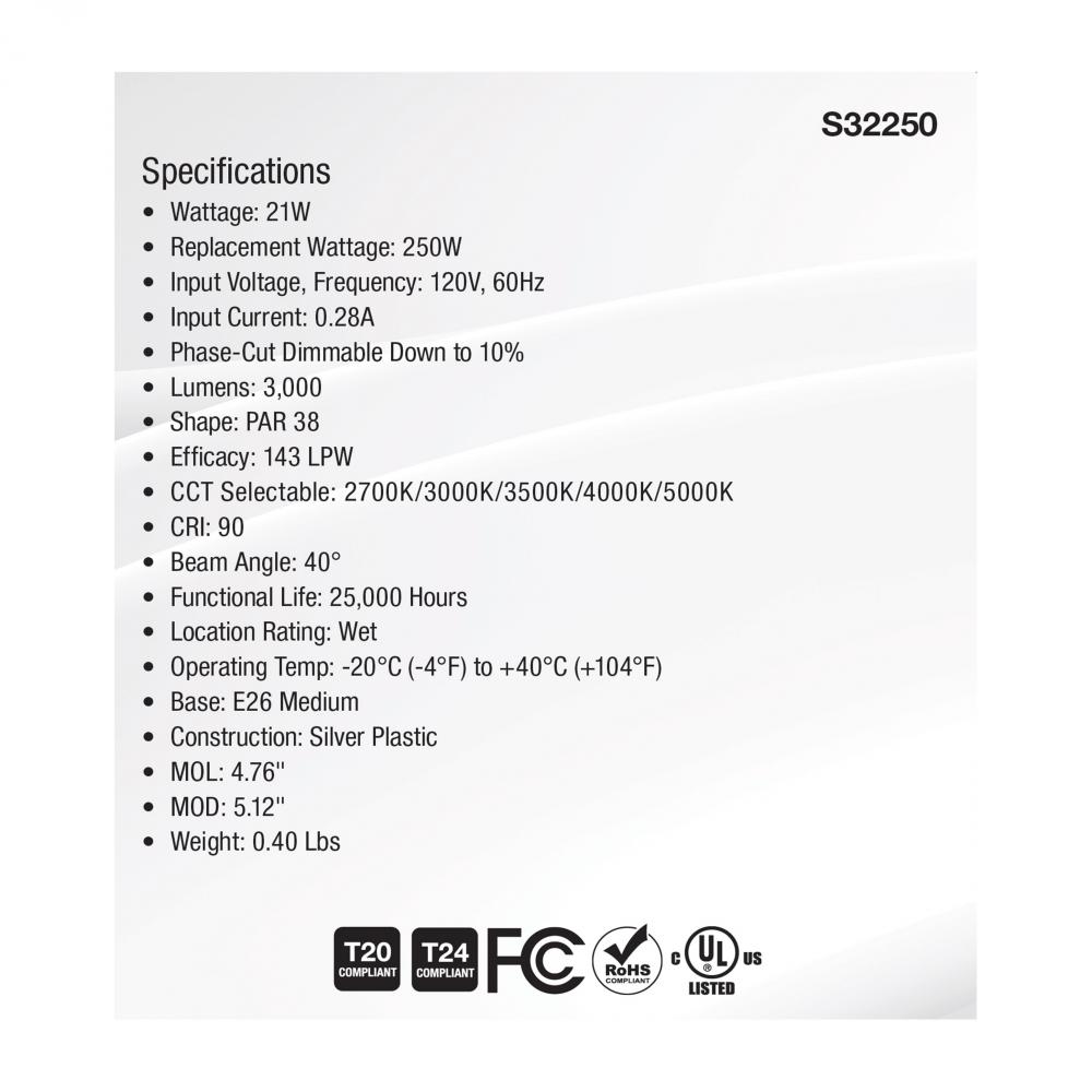 21 Watt PAR38 High Lumen LED; 27K/30K/35K/40K/50K CCT Selectable; Medium Base; 120 Volt