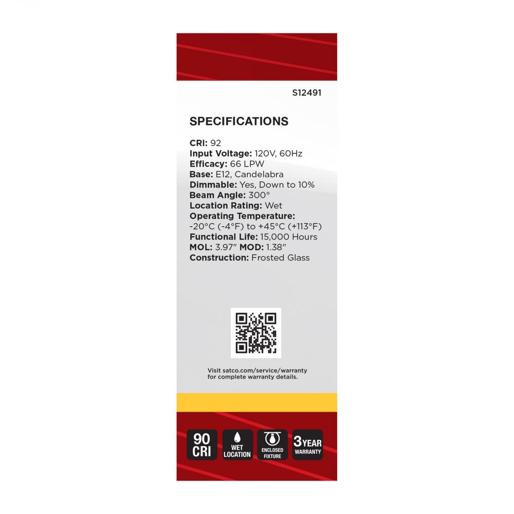 Satco's S12491 3-watt LED lamp is traditional, yet contemporary with its sleek finish and energy saving LED technology. Elegantly illuminate any room in the house with this dimmable, frost finished bulb. Sophisticated and modern, this lamp delivers 15,