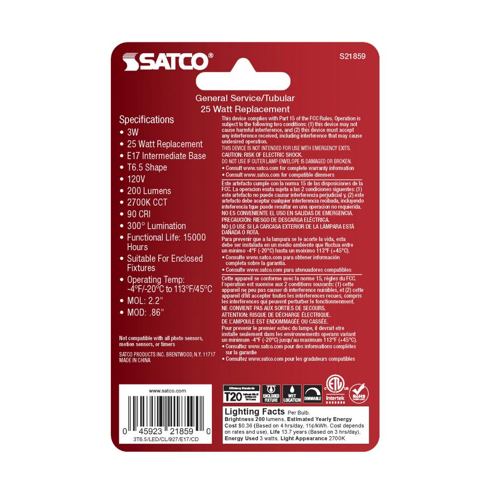 Satco's 3-watt, T6.5 bulb with an intermediate base is dimmable and offers warm white light with a 300 degree beam spread. Wet rated for use in kitchens and bathrooms, the carded 2-pack is suitable for retail display. Elegant and long-lasting, this cle