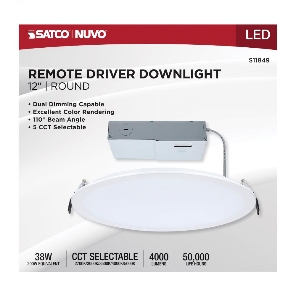 38 Watt; 12 Inch LED Direct Wire Downlight; Remote Driver; CCT Selectable; Dual Dimming; Flat Face; by Satco Products Inc.