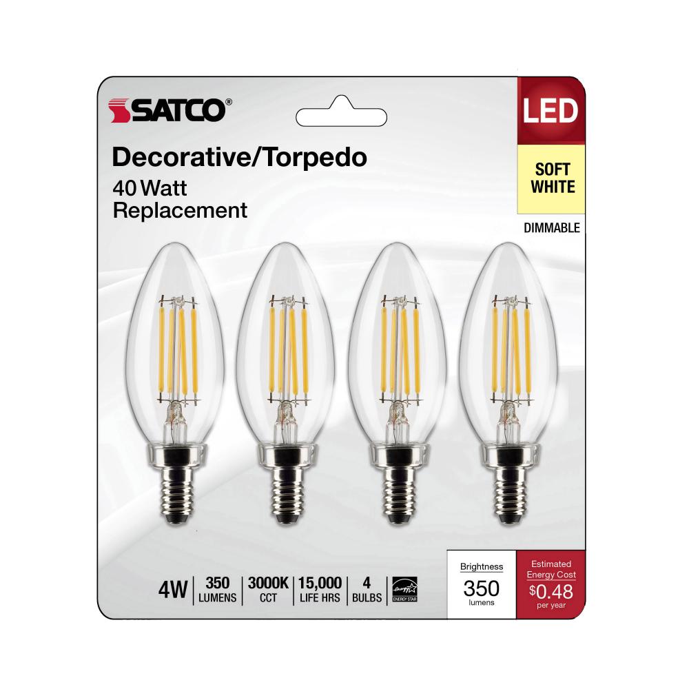 4 Watt B11 LED Filament; Clear; Candelabra Base; 3000K; 350 Lumens; 120 Volt; 4-Pack by Satco Products Inc.