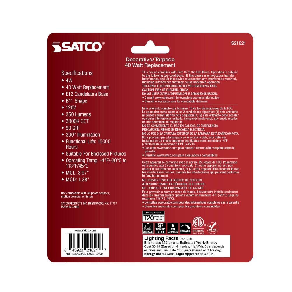 Satco's S21821 4-watt, LED B11 bulb with a candelabra base is dimmable and offers soft white light and a 300 degree beam spread. Wet rated for kitchens and bathrooms, the carded 4-pack is suitable for retail display. Elegant and long-lasting, this clea