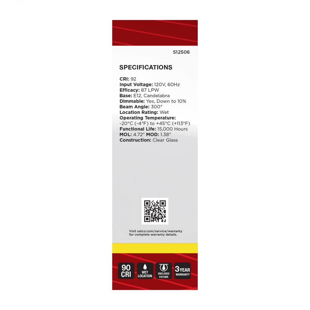 4 Watt CA10 LED; Candelabra Base; Clear; 3500K CCT; 120 Volt by Satco Products Inc.