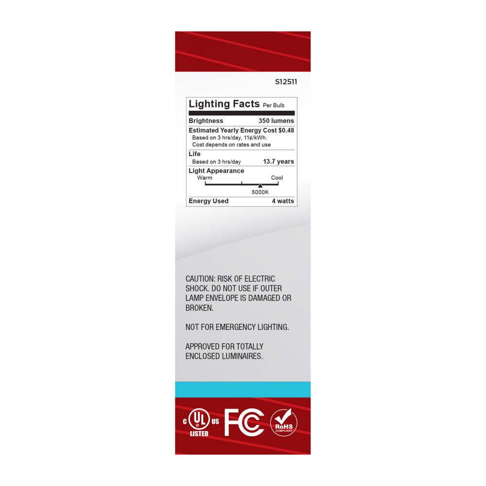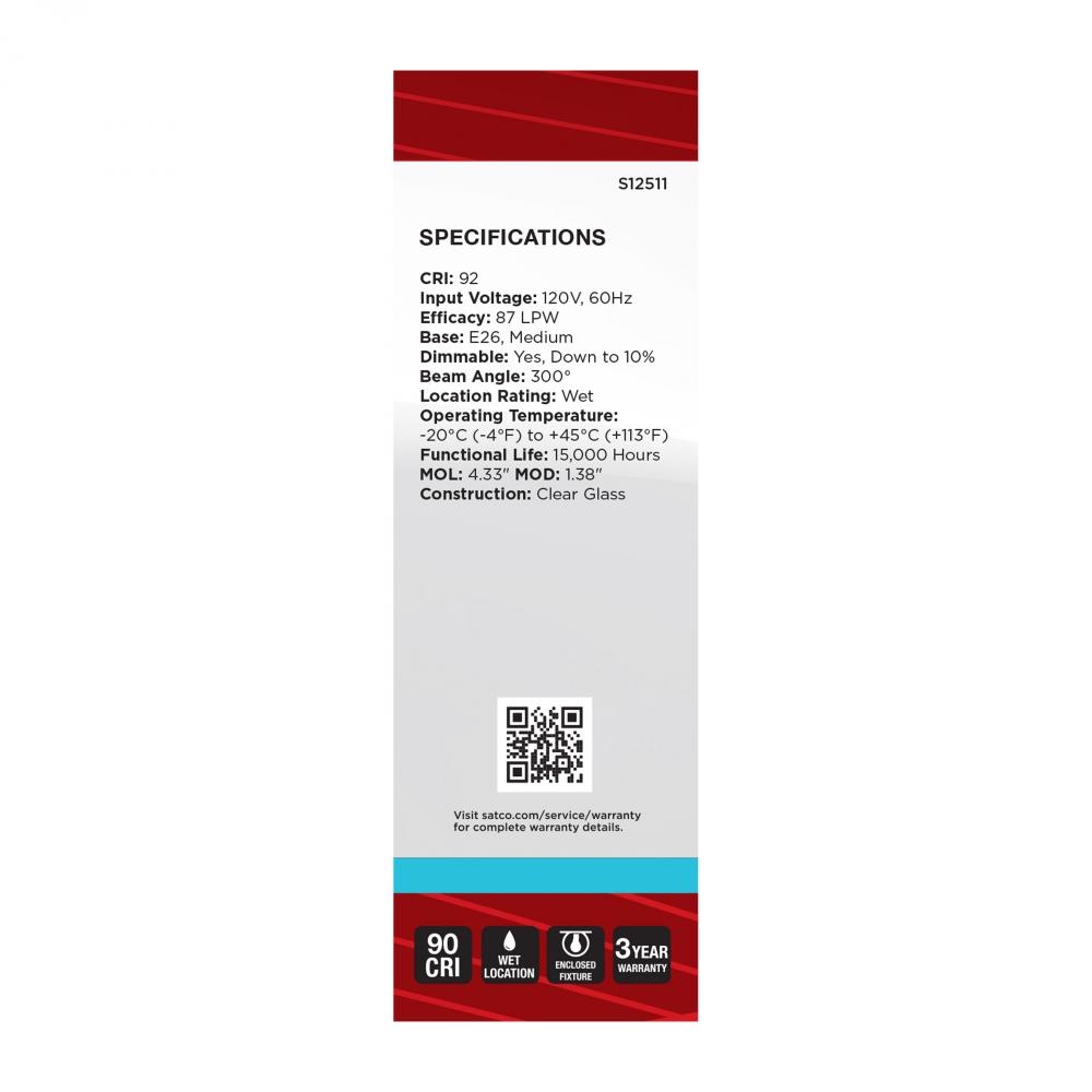 Satco's S12511 4-watt LED lamp is traditional, yet contemporary with its vintage style and energy saving LED technology. Elegantly illuminate any room in the house with this dimmable, clear bulb. Sophisticated and modern, this lamp delivers 15,000 hour