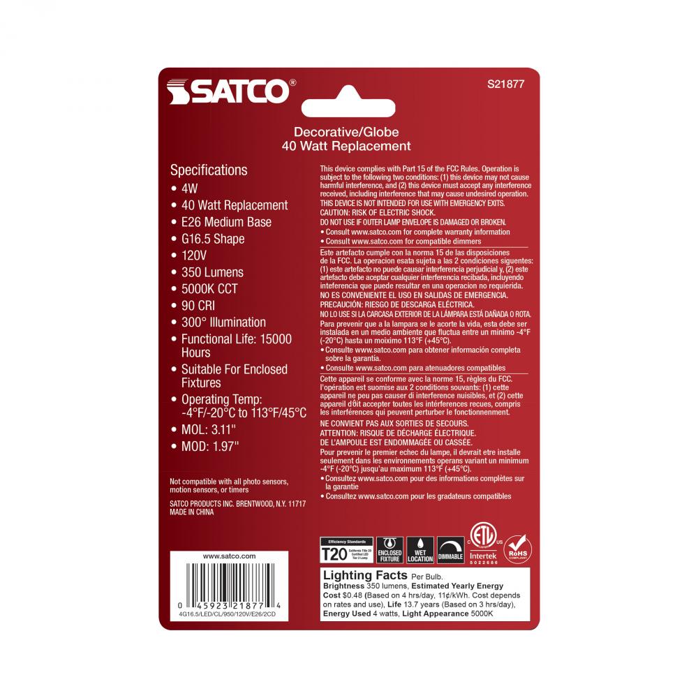 SATCO NUVO's S21877 4-watt clear, LED G16.5 bulb with a medium base is dimmable and offers 5000K natural light. Wet rated for indoor and outdoor applications, the carded 2-pack is suitable for retail display. Elegant and long-lasting, this clear bulb d