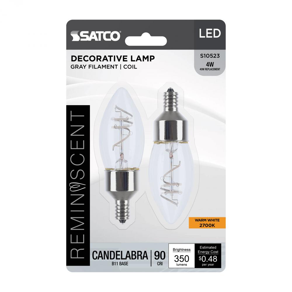 4 Watt LED; Reminiscent; Flex Gray Coil Filament; B11; Candelabra Base; 2700K CCT; Clear; 120 Volt; by Satco Products Inc.