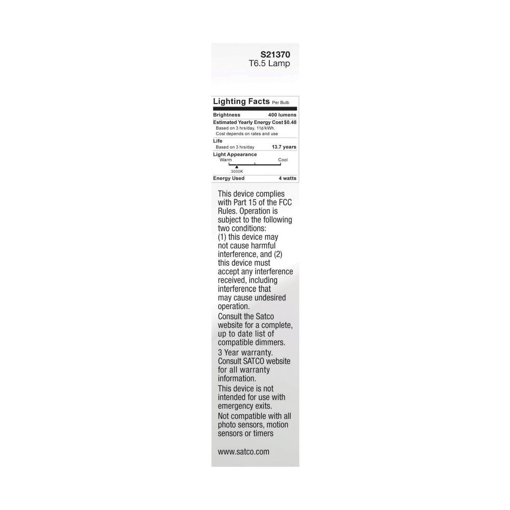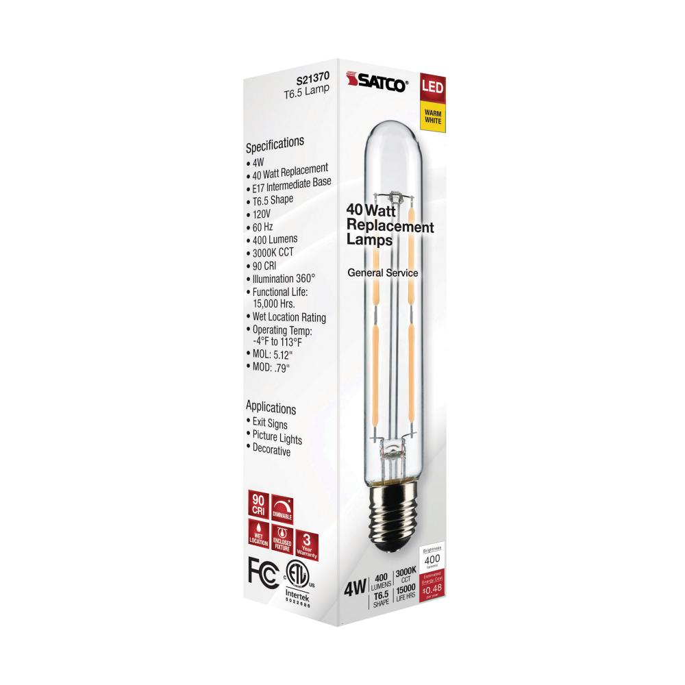 4 Watt T6.5 LED Filament; Clear; Intermediate Base; 3000K; 400 Lumens; 120 Volt by Satco Products Inc.