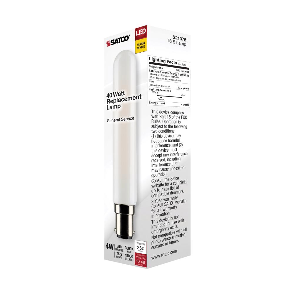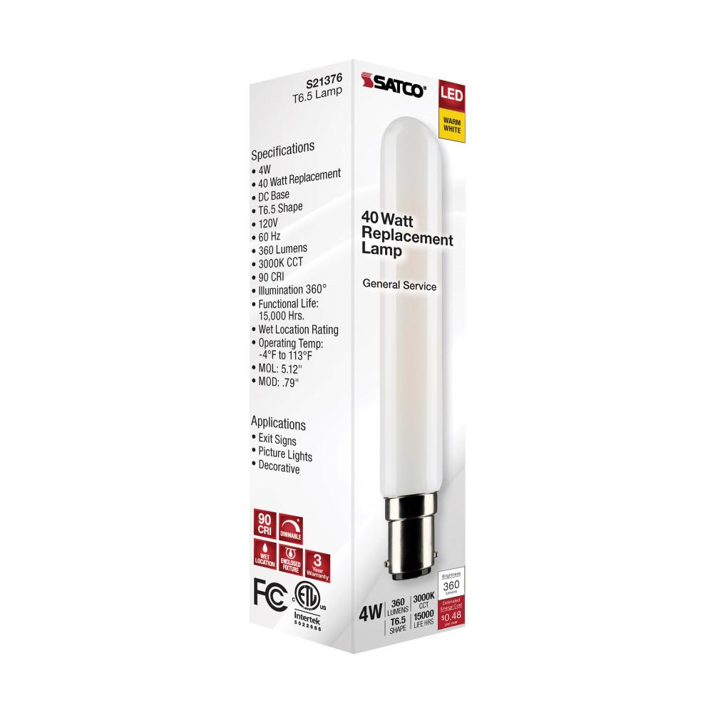 4 Watt T6.5 LED Filament; Frosted; Double Contact Bayonet Base; 3000K; 360 Lumens; 120 Volt by Satco Products Inc.