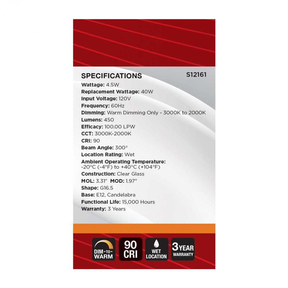 4.5 Watt LED G16.5; 3000K-2000K Warm Dimming; Candelabra Base; Clear Finish