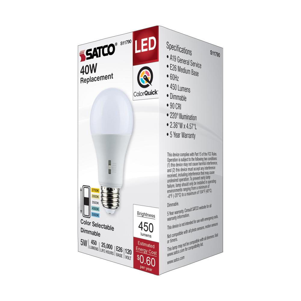 Illuminate any space with ease using SATCO NUVO's 5W A19 lamps with E26 base and ColorQuick technology. These versatile lamps allow you to choose the perfect color temperature for any room, creating an atmosphere that suits your mood. Whether you want