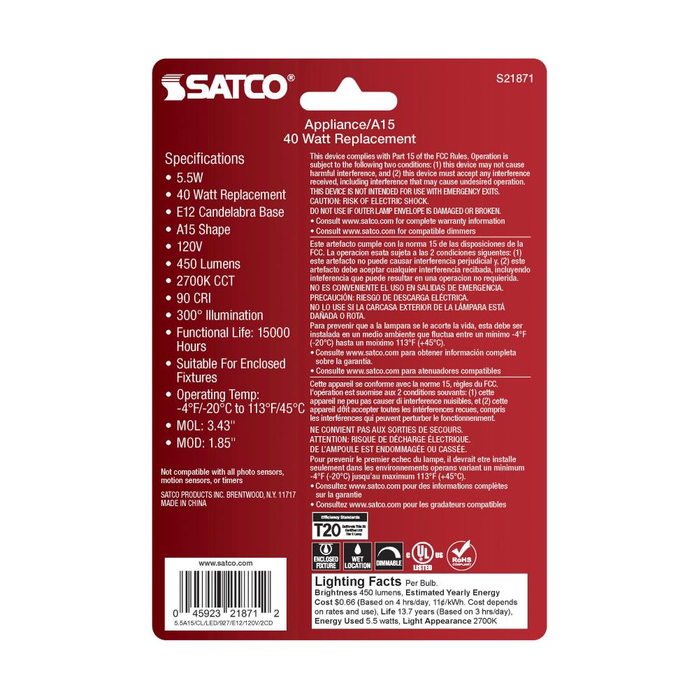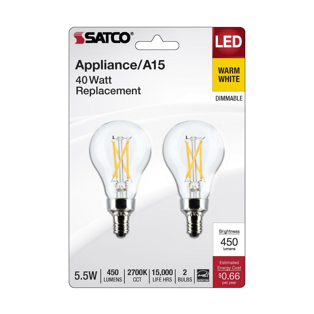 Satco's 5.5-watt, A15 LED bulb with a candelabra base is dimmable and offers warm white light with a 300 degree beam spread. Wet rated for use in kitchens and bathrooms, the carded 2-pack is suitable for retail display. Elegant and long-lasting, this c