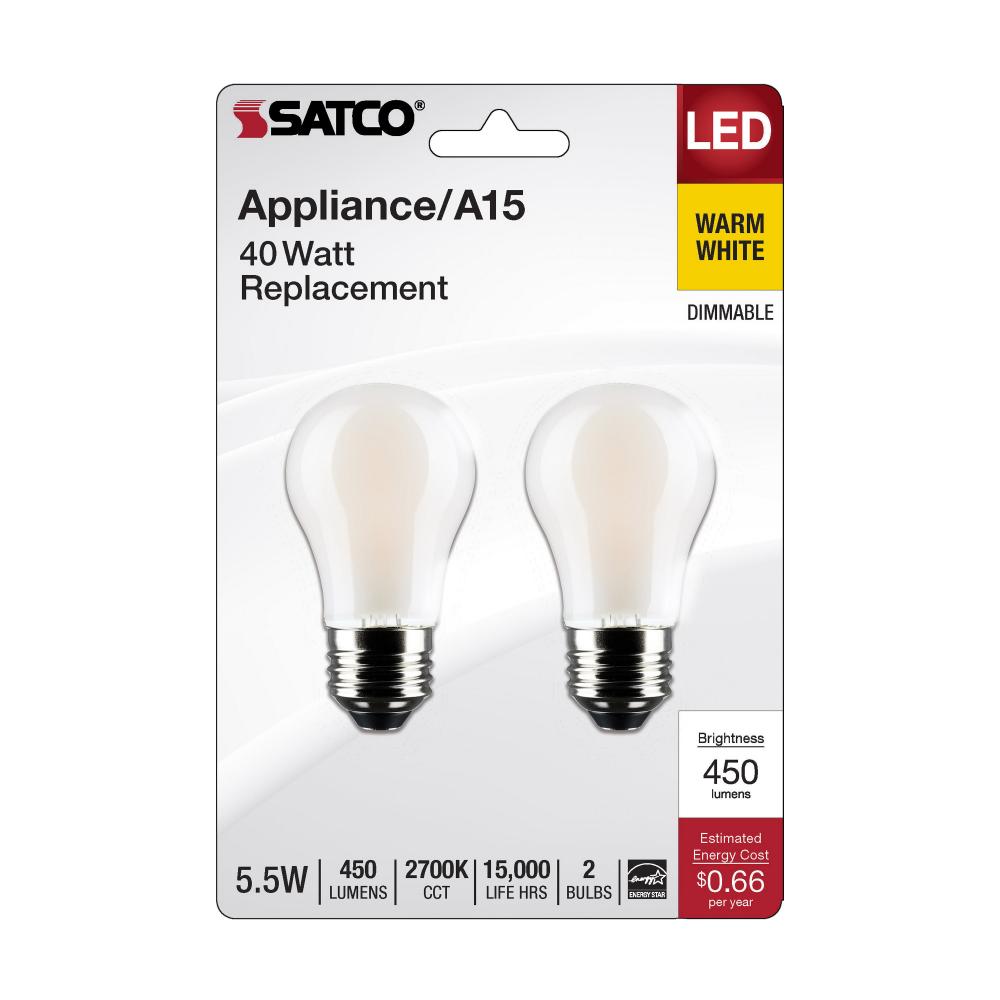 Satco's 5.5-watt, A15 LED bulb with a medium base is dimmable and offers warm white light with a 320 degree beam spread. Wet rated for use in kitchens and bathrooms, the carded 2-pack is suitable for retail display. Elegant and long-lasting, this frost