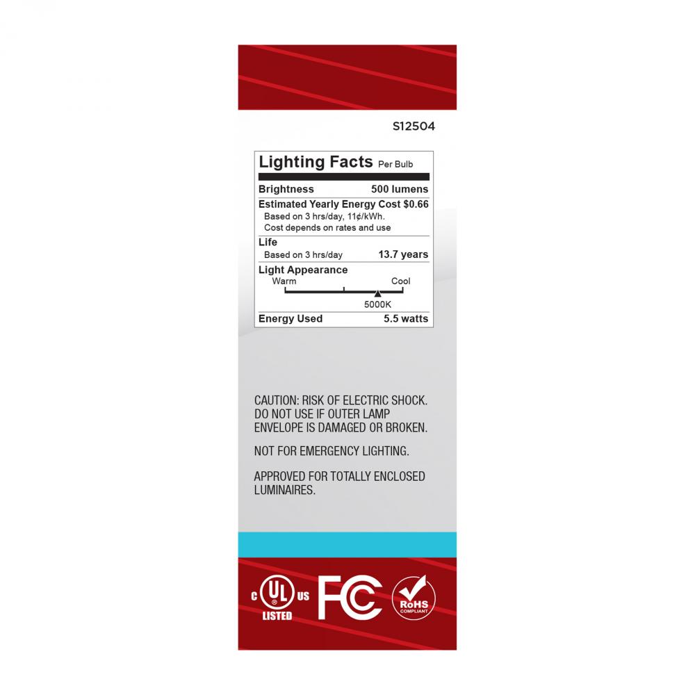 Satco's S12504 5.5-watt LED lamp is traditional, yet contemporary with its vintage style and energy saving LED technology. Elegantly illuminate any room in the house with this dimmable, clear bulb. Sophisticated and modern, this lamp delivers 15,000 ho