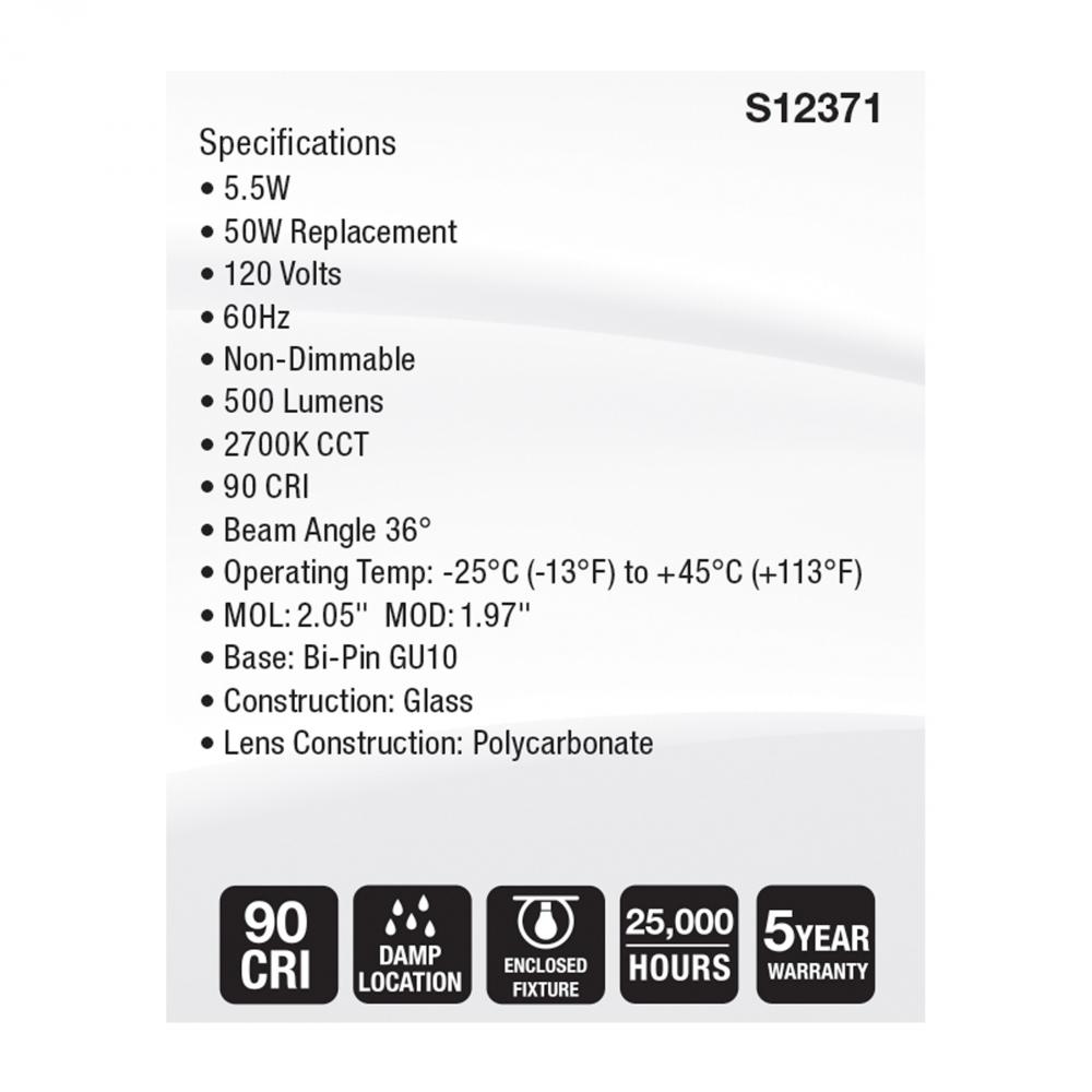 SATCO S12371 MR16 lamps provide high color accuracy with a 90 CRI and are dimmable for customizable lighting. These lamps are also damp location rated, and suitable for use in enclosed fixtures. Perfect for a variety of residential and commercial applicati