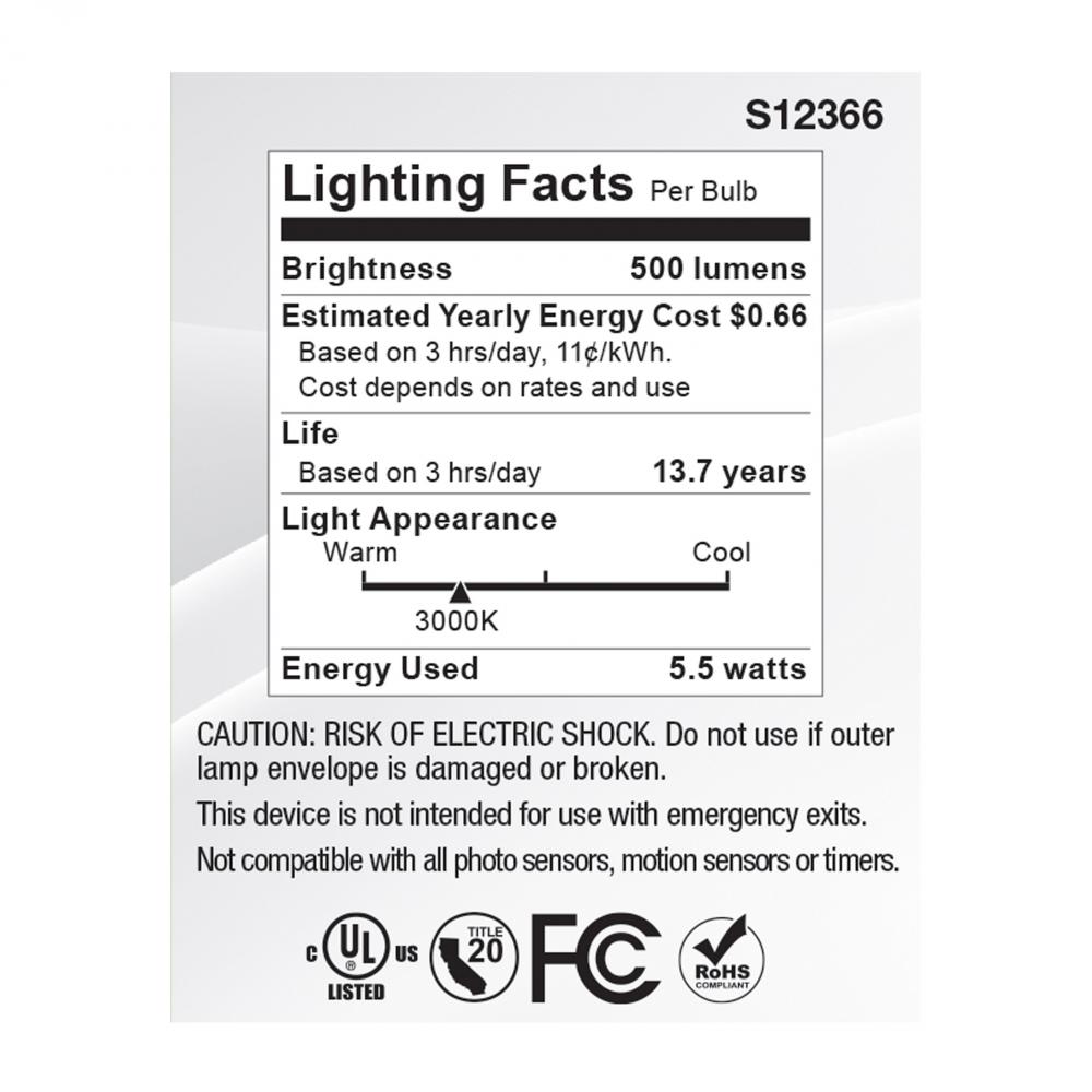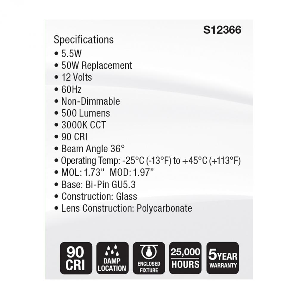 SATCO S12366 MR16 lamps provide high color accuracy with a 90 CRI and are dimmable for customizable lighting. These lamps are also damp location rated, and suitable for use in enclosed fixtures. Perfect for a variety of residential and commercial applicati