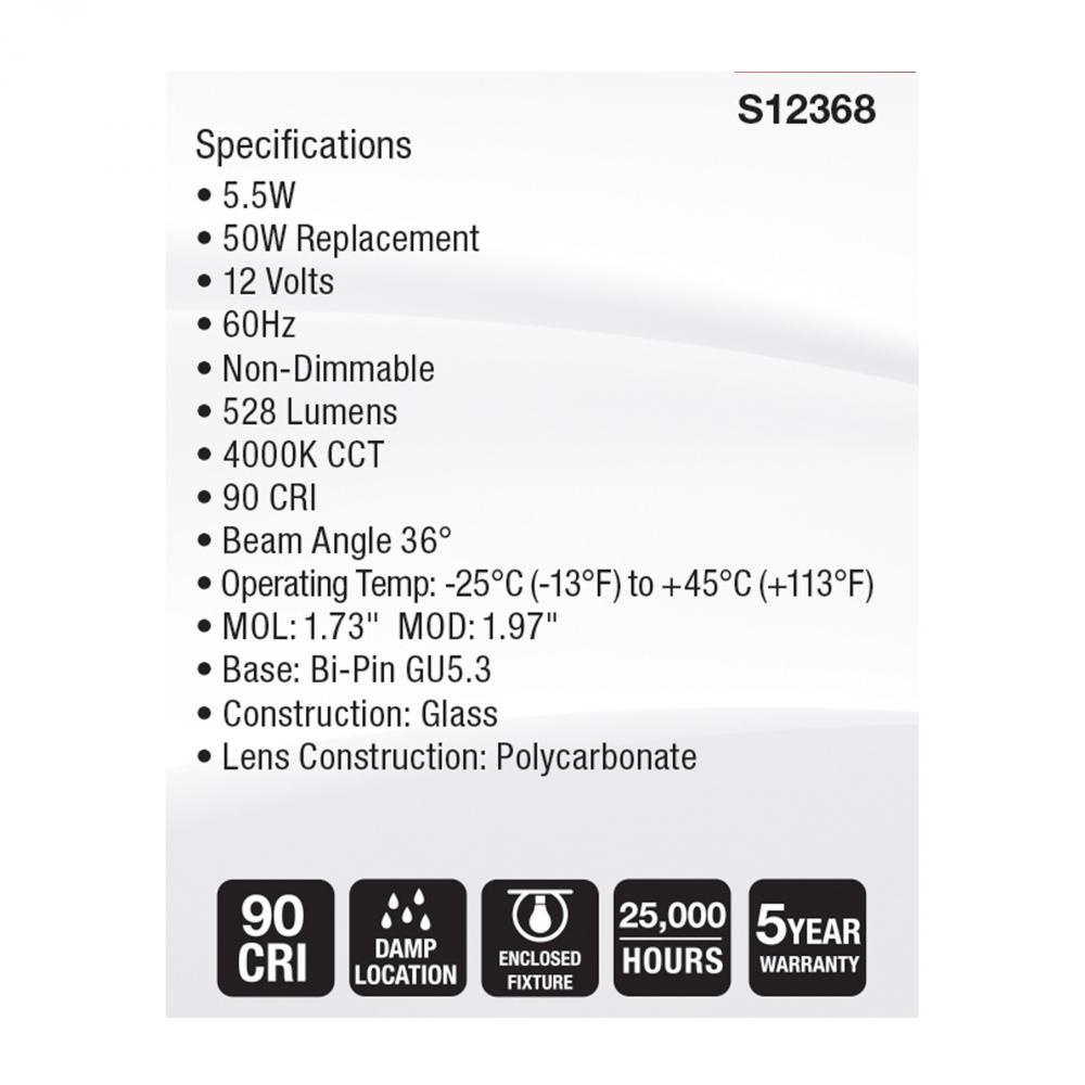 SATCO S12368 MR16 lamps provide high color accuracy with a 90 CRI and are dimmable for customizable lighting. These lamps are also damp location rated, and suitable for use in enclosed fixtures. Perfect for a variety of residential and commercial applicati