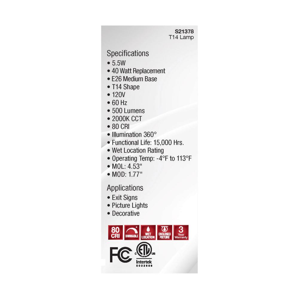 5.5 Watt T14 LED Filament; Clear; Medium Base; 2000K; 500 Lumens; 120 Volt by Satco Products Inc.