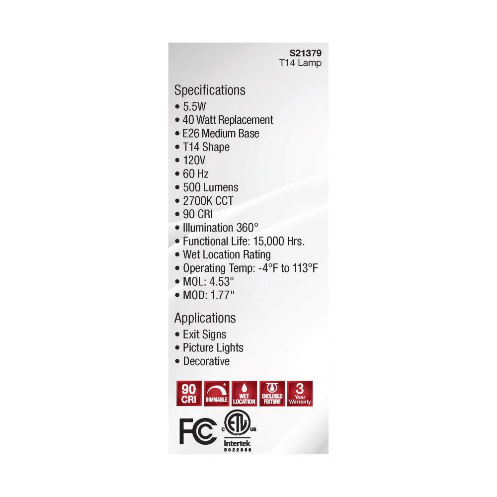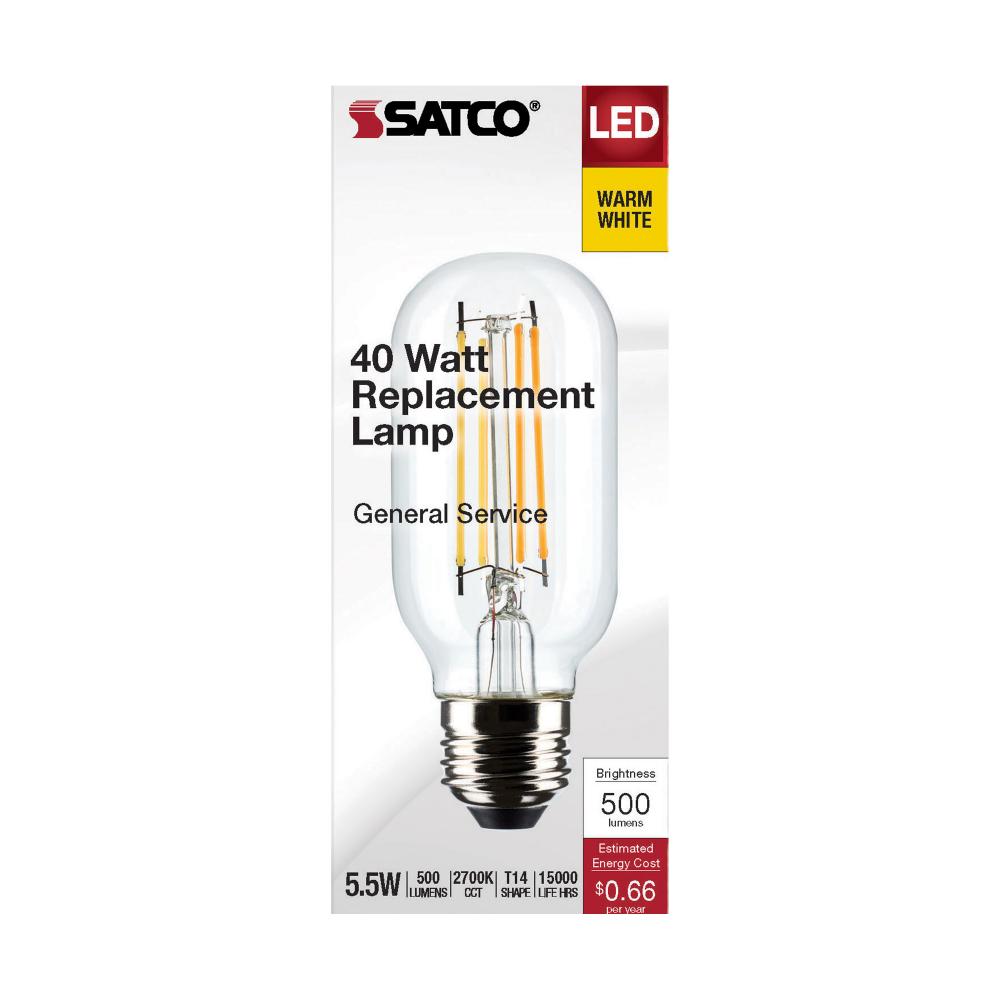 5.5 Watt T14 LED Filament; Clear; Medium Base; 2700K; 500 Lumens; 120 Volt by Satco Products Inc.