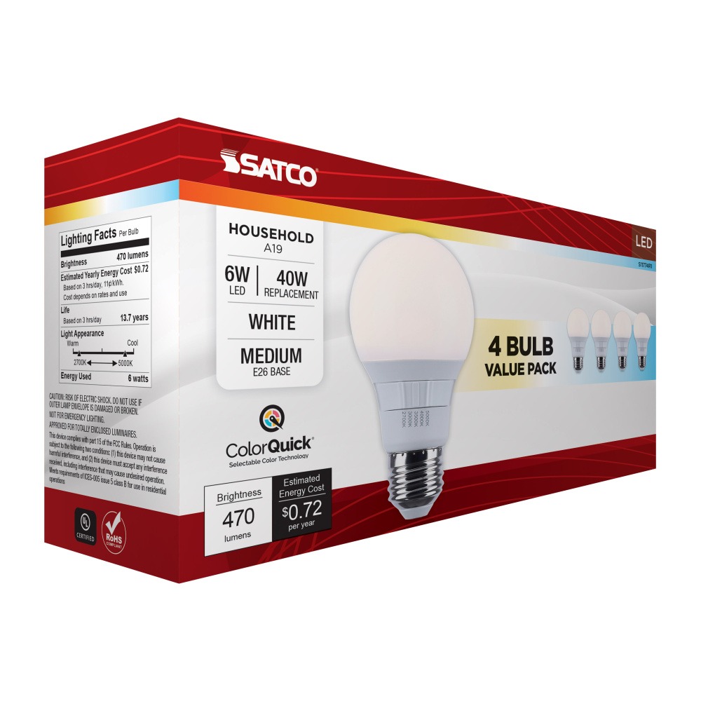 Elevate your everyday lighting with SATCO NUVO's S11774R1 6W LED A19 bulb-designed for flexibility, clarity, and dependable performance. Sold in a convenient, money-saving 4-pack, this bulb offers 5 CCT selectable options from a cozy 2700K to a vibrant