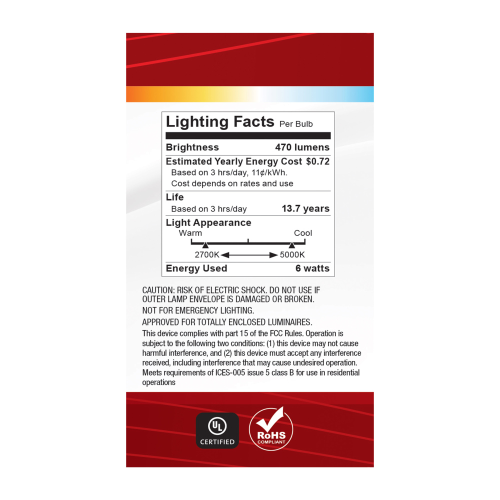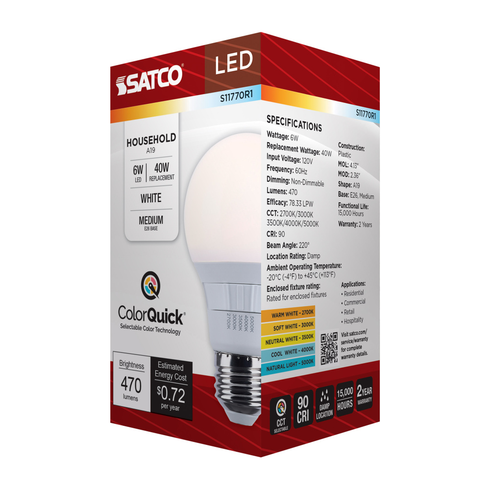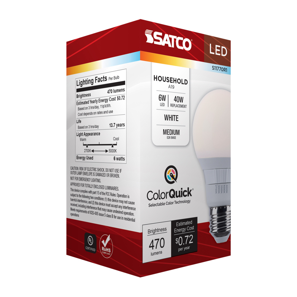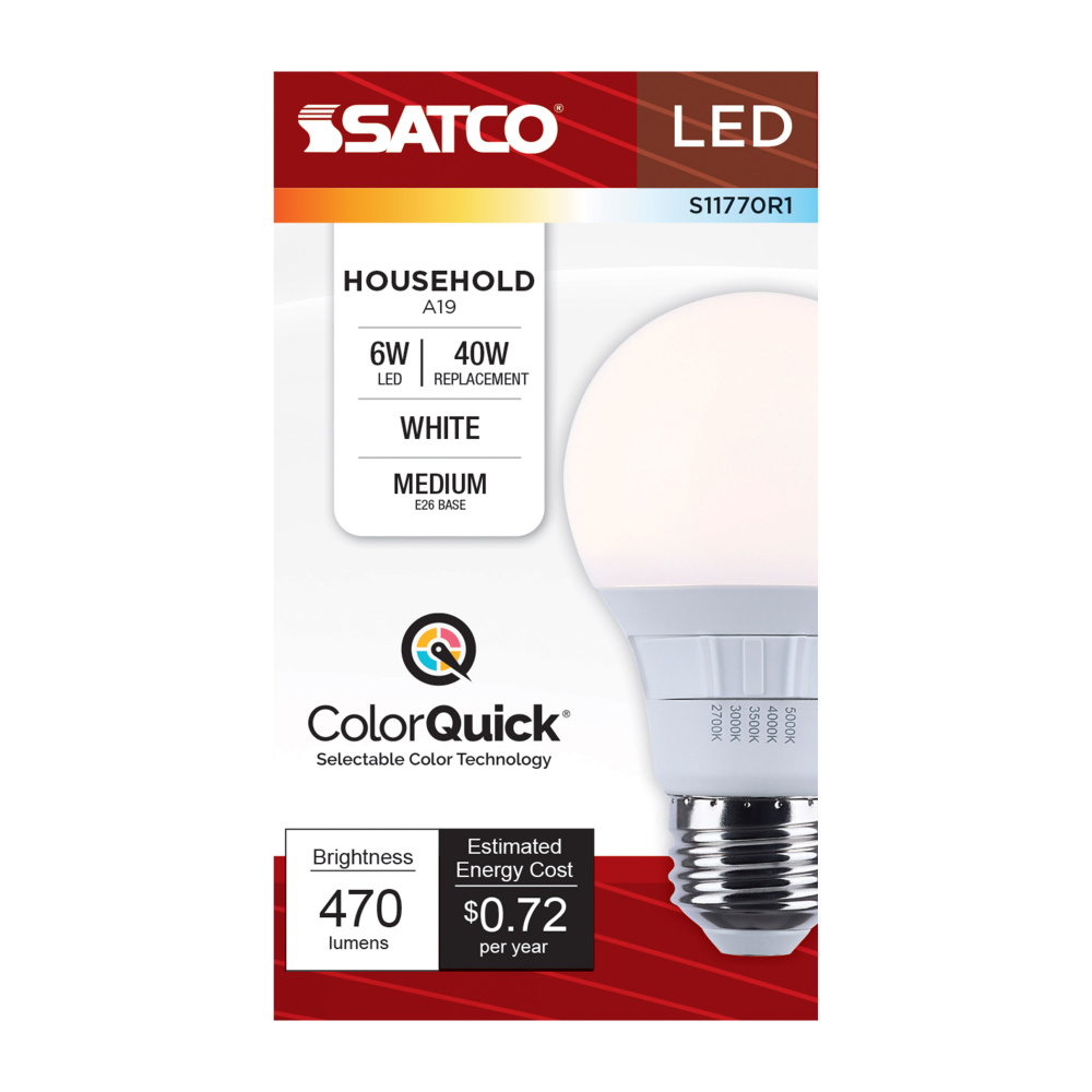 Elevate your everyday lighting with SATCO NUVO's S11770R1 6W LED A19 bulb-designed for flexibility, clarity, and dependable performance. With 5 CCT selectable options from a cozy 2700K to a vibrant 5000K, you can tailor the ambiance to suit any environ