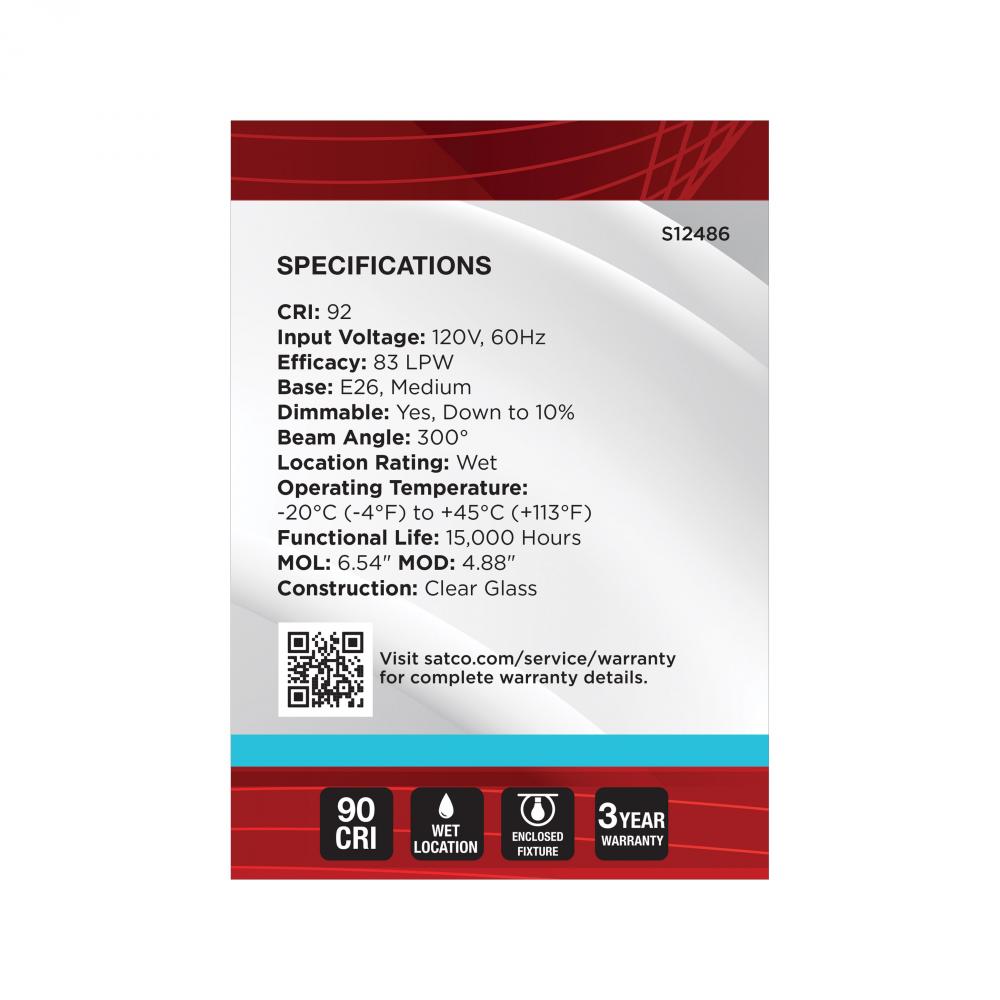 Satco's S12486 6-watt LED lamp is traditional, yet contemporary with its vintage style and energy saving LED technology. Elegantly illuminate any room in the house with this dimmable, globe shaped bulb. Sophisticated and modern, this lamp delivers 15,0