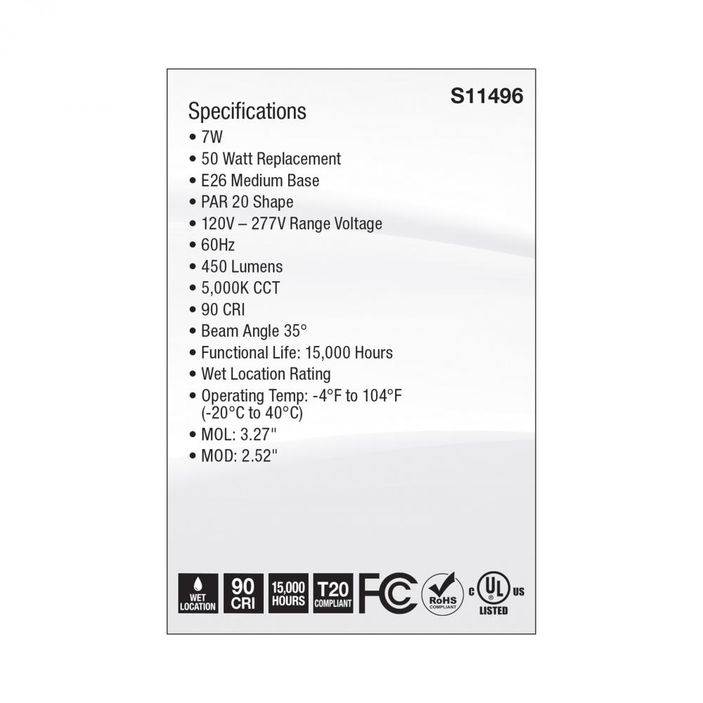 SATCO NUVO's S11496 PAR20 Range Voltage lamp is designed for application in 120V-277V fixtures. With crisp, 90 CRI light output in 5000K, this is an ideal lamp for residential commercial, hospitality, general lighting, recessed downlighting and task li