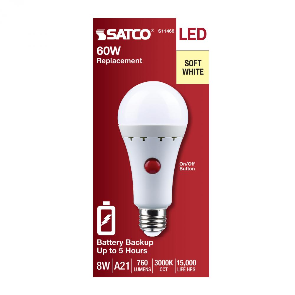 8 Watt A21 LED; 3000K; Medium Base; 120 Volt; 80 CRI; Battery Backup by Satco Products Inc.