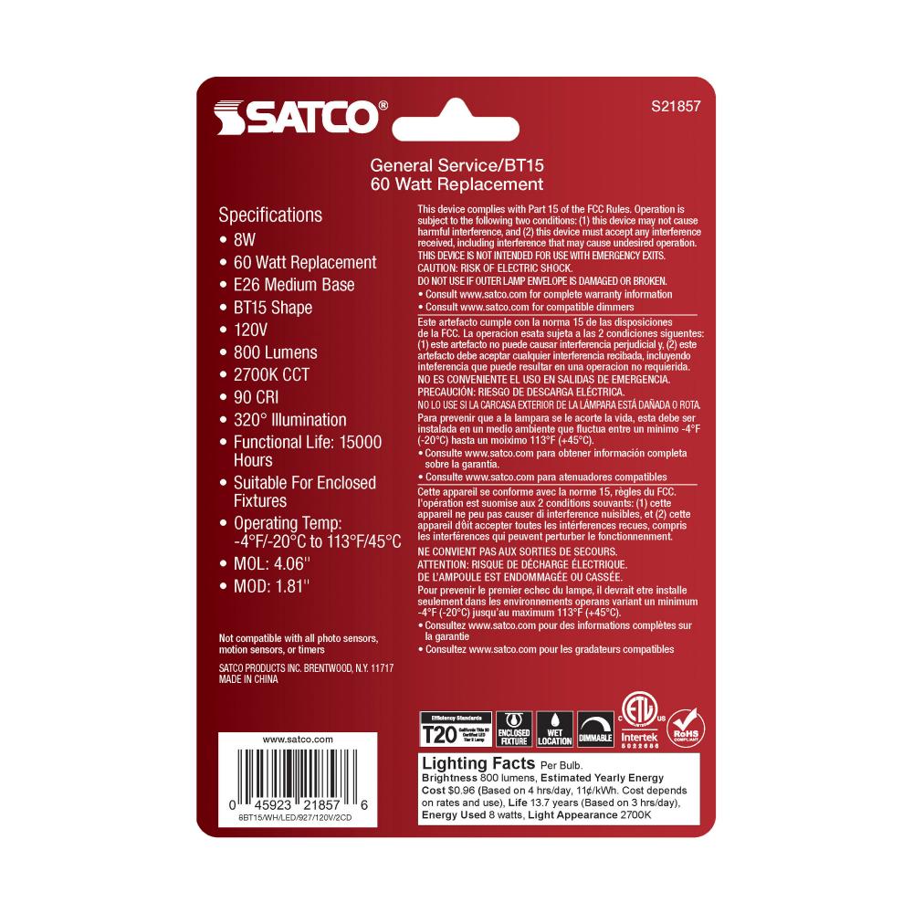 Satco's S21857 8-watt, BT15 bulb with a medium base is dimmable and offers warm white light with a 320 degree beam spread. Wet rated for use in kitchens and bathrooms, the carded 2-pack is suitable for retail display. Elegant and long-lasting, this whi