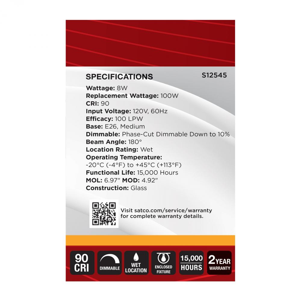 8 Watt G40 LED; Medium Base; 2700K CCT; Silver Crown; 100 Watt Replacement by Satco Products Inc.
