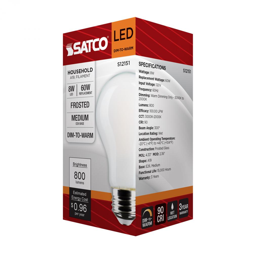 8 Watt LED A19; 3000K-2000K Warm Dimming; Medium Base; Frost Finish by Satco Products Inc.