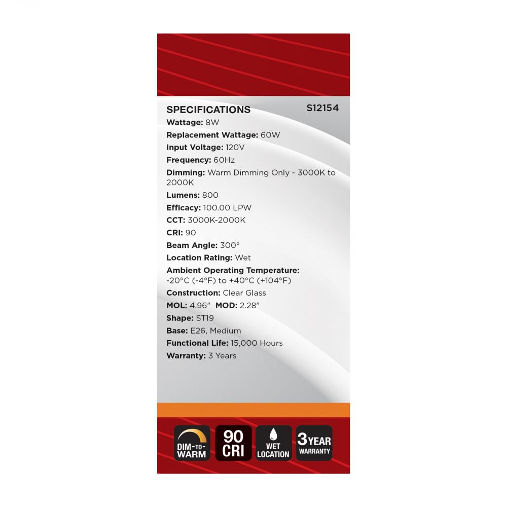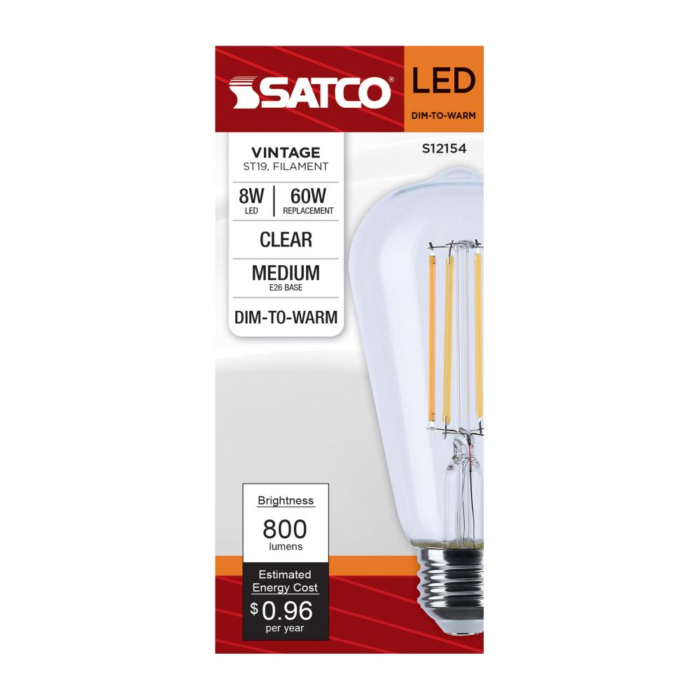 8 Watt LED ST19; 3000K-2000K Warm Dimming; Medium Base; Clear Finish by Satco Products Inc.