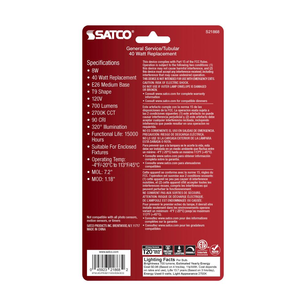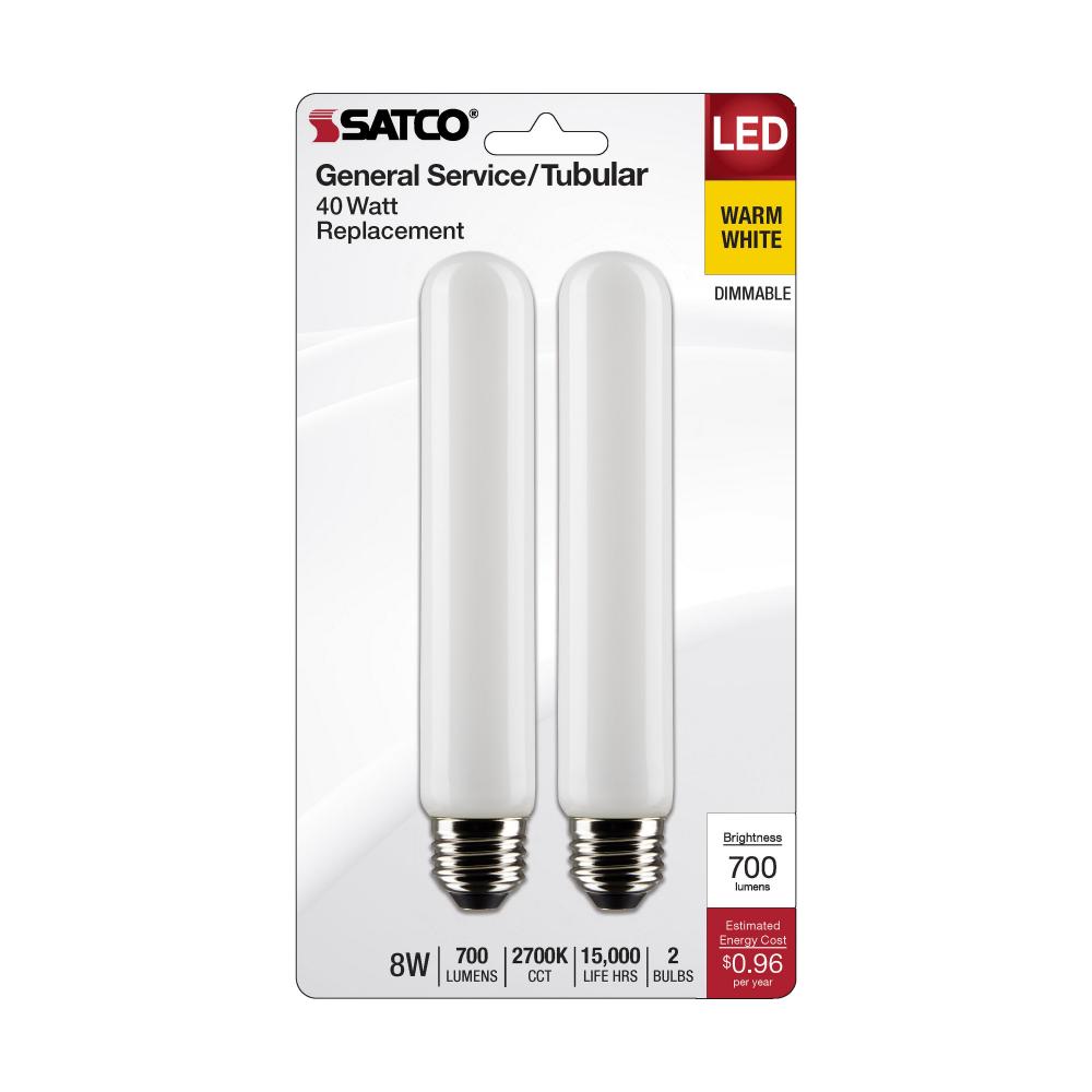 Satco's 8-watt, T9 LED bulb with a medium base is dimmable and offers warm white light with a 320 degree beam spread. Wet rated for use in kitchens and bathrooms, the carded 2-pack is suitable for retail display. Elegant and long-lasting, this frosted