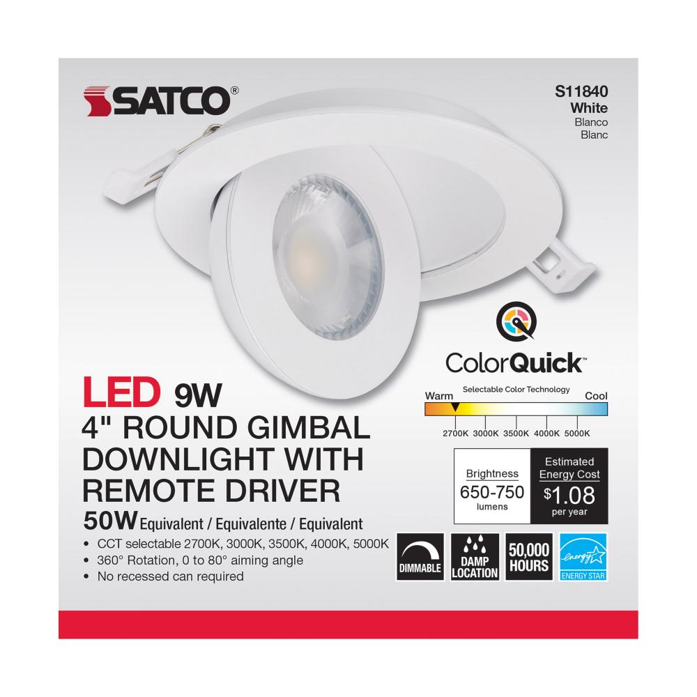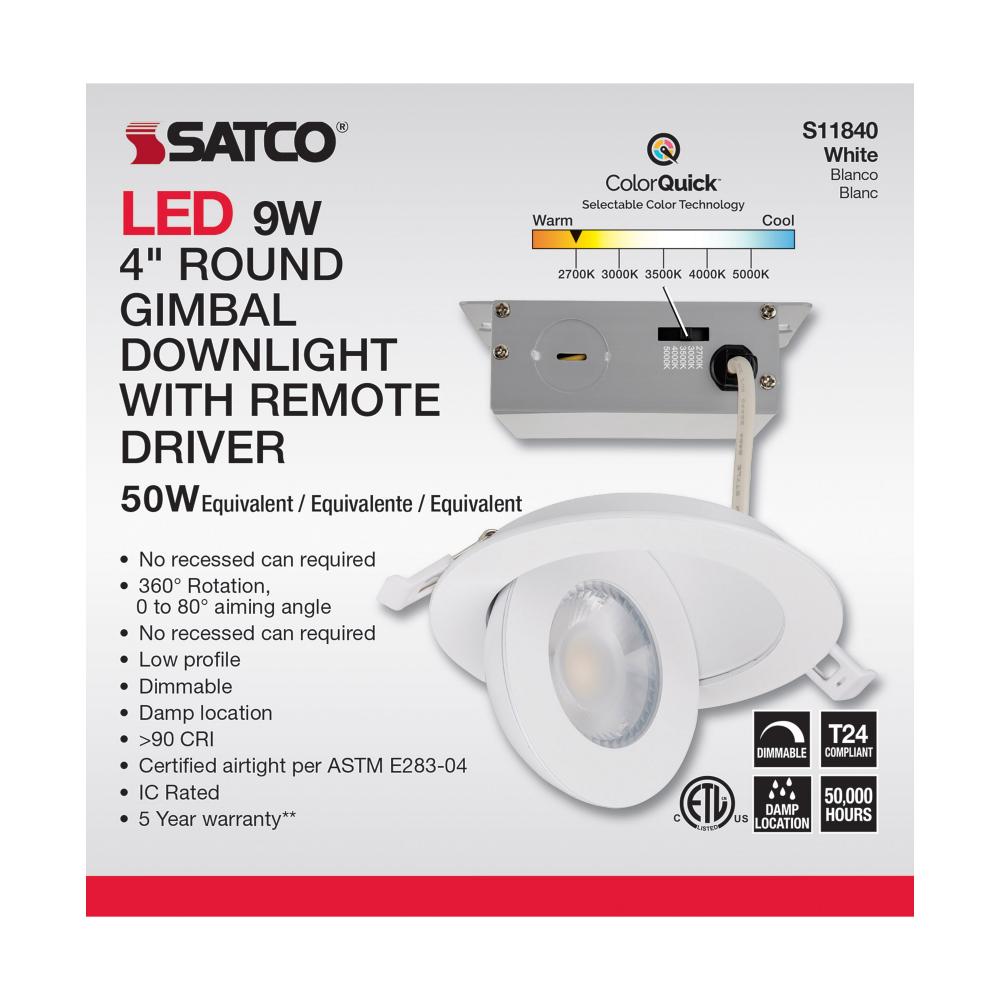9 Watt; CCT Selectable; LED Direct Wire Downlight; Gimbaled; 4 Inch Round; Remote Driver; White by Satco Products Inc.