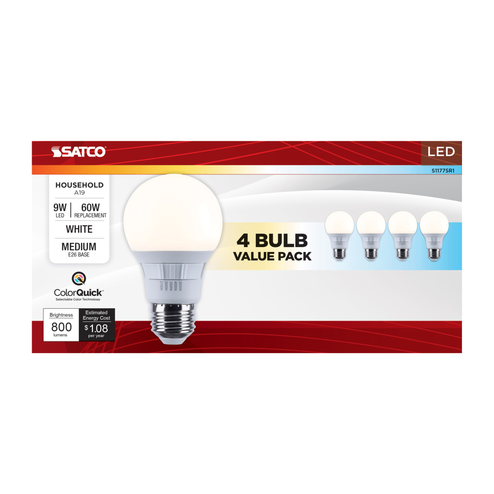 Elevate your everyday lighting with SATCO NUVO's S11775R1 9W LED A19 bulb-designed for flexibility, clarity, and dependable performance. Sold in a convenient, money-saving 4-pack, this bulb offers 5 CCT selectable options from a cozy 2700K to a vibrant