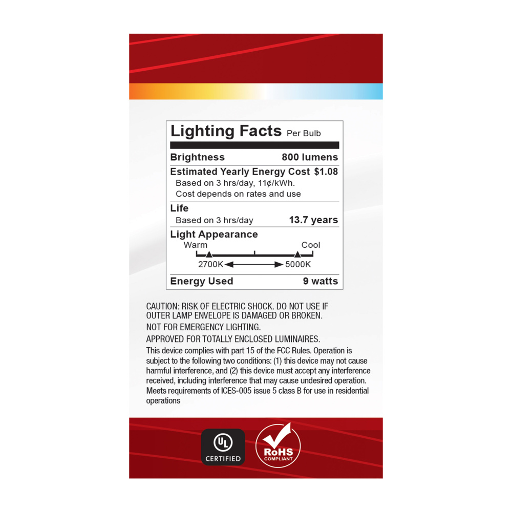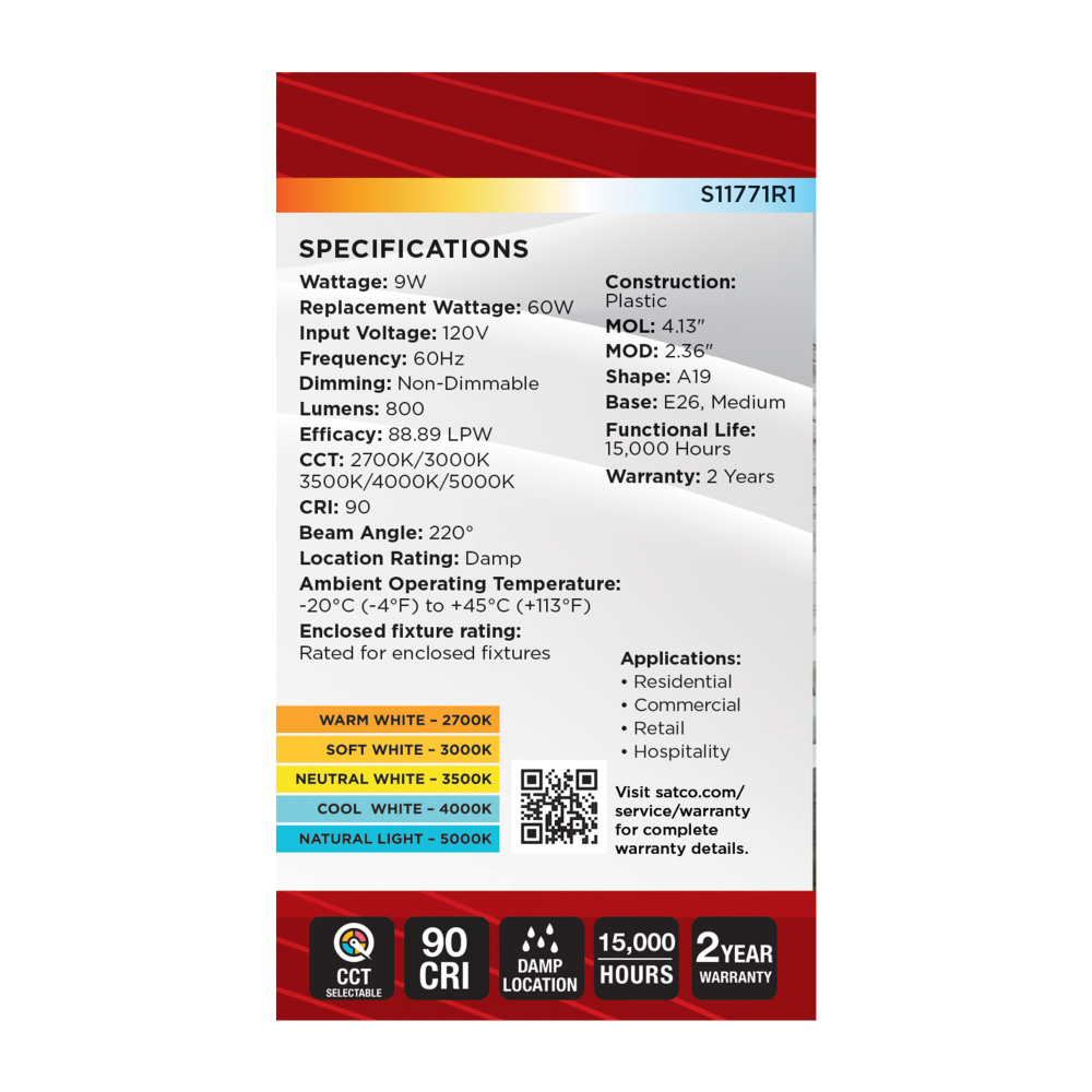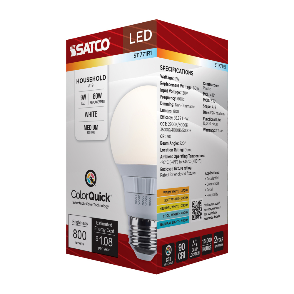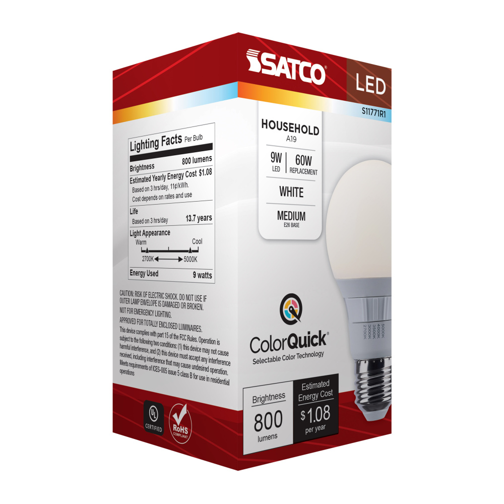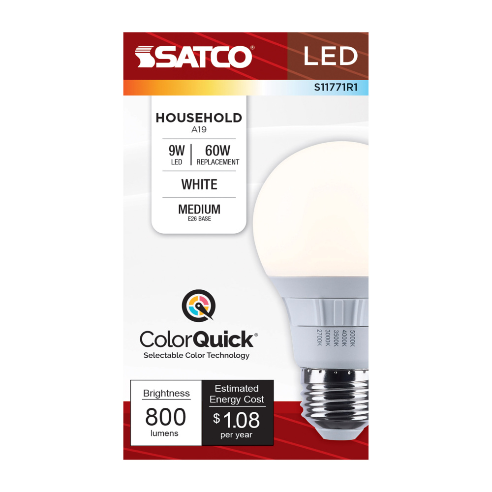 Elevate your everyday lighting with SATCO NUVO's S11771R1 9W LED A19 bulb-designed for flexibility, clarity, and dependable performance. With 5 CCT selectable options from a cozy 2700K to a vibrant 5000K, you can tailor the ambiance to suit any environ