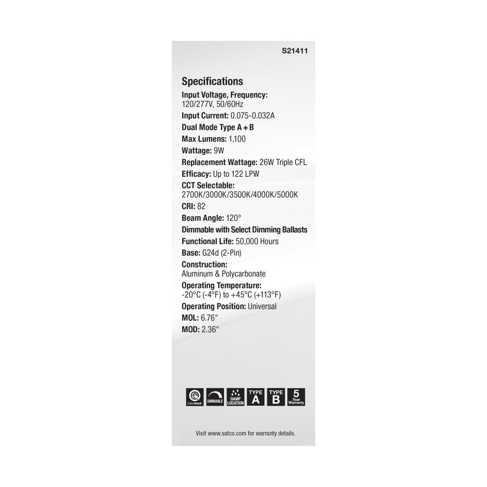 9 Watt PL 2-Pin LED; 1100 Lumens; G24d Base; CCT Selectable; White Finish; 120-277 Volts by Satco Products Inc.
