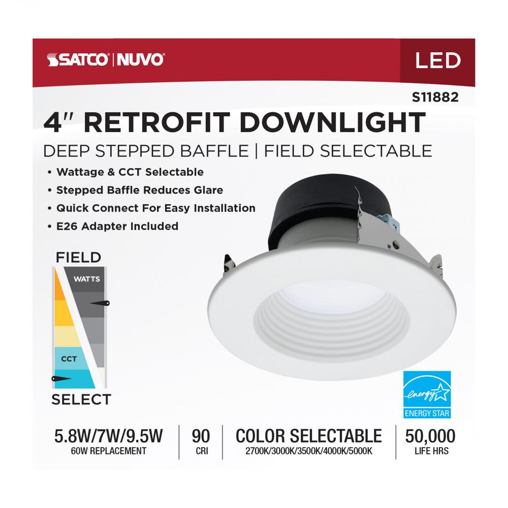 Field Selectable LED Downlight Retrofit; Deep Baffle; 5.8/7/9.5 Watts; 27K/30K/35K/40K/50K CCT; 4 Inch; Round Shape; White Finish; 120 Volts