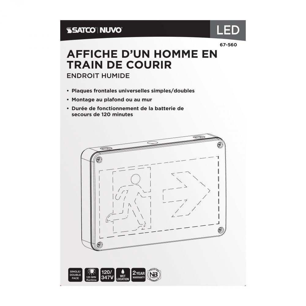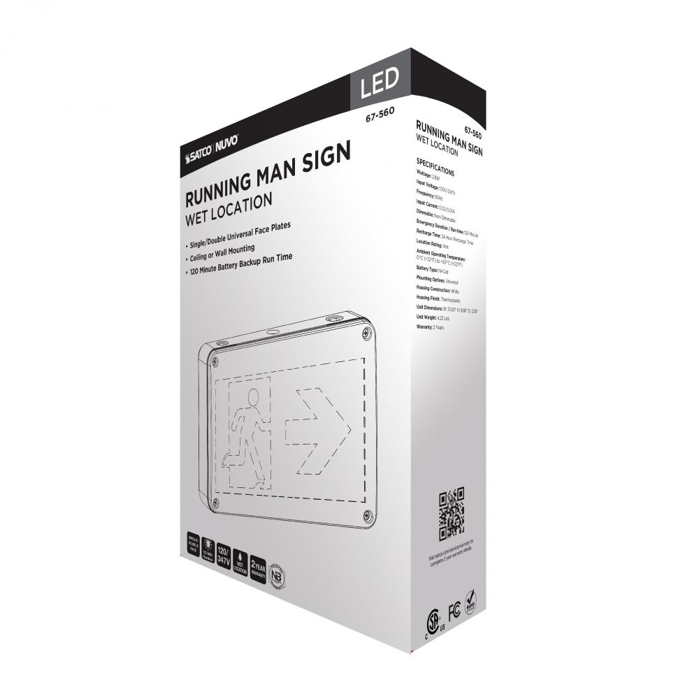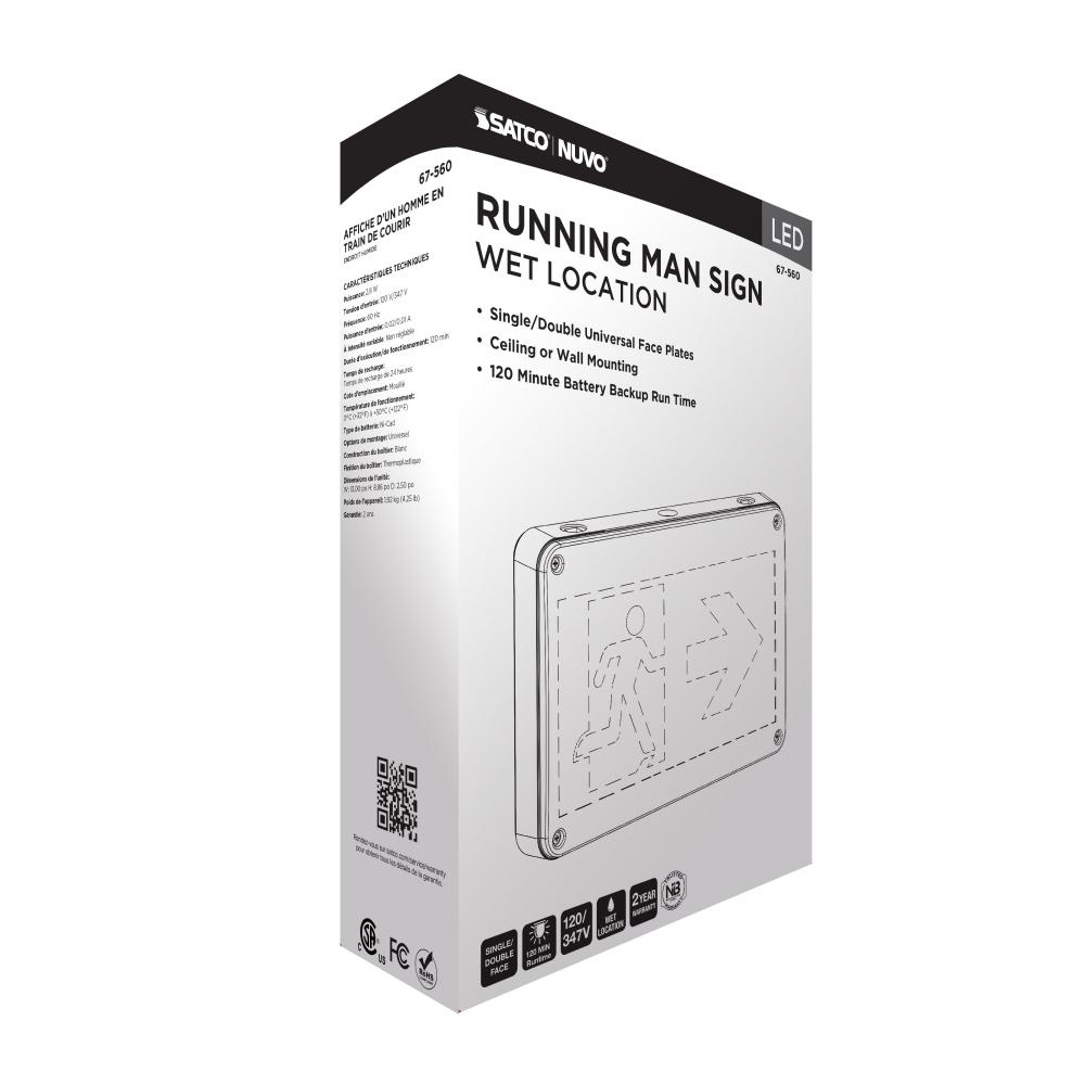 Running Man Green Exit Sign; 120/347V; 2HR backup; Single/Dual Face; Universal Mounting; Wet by Satco Products Inc.