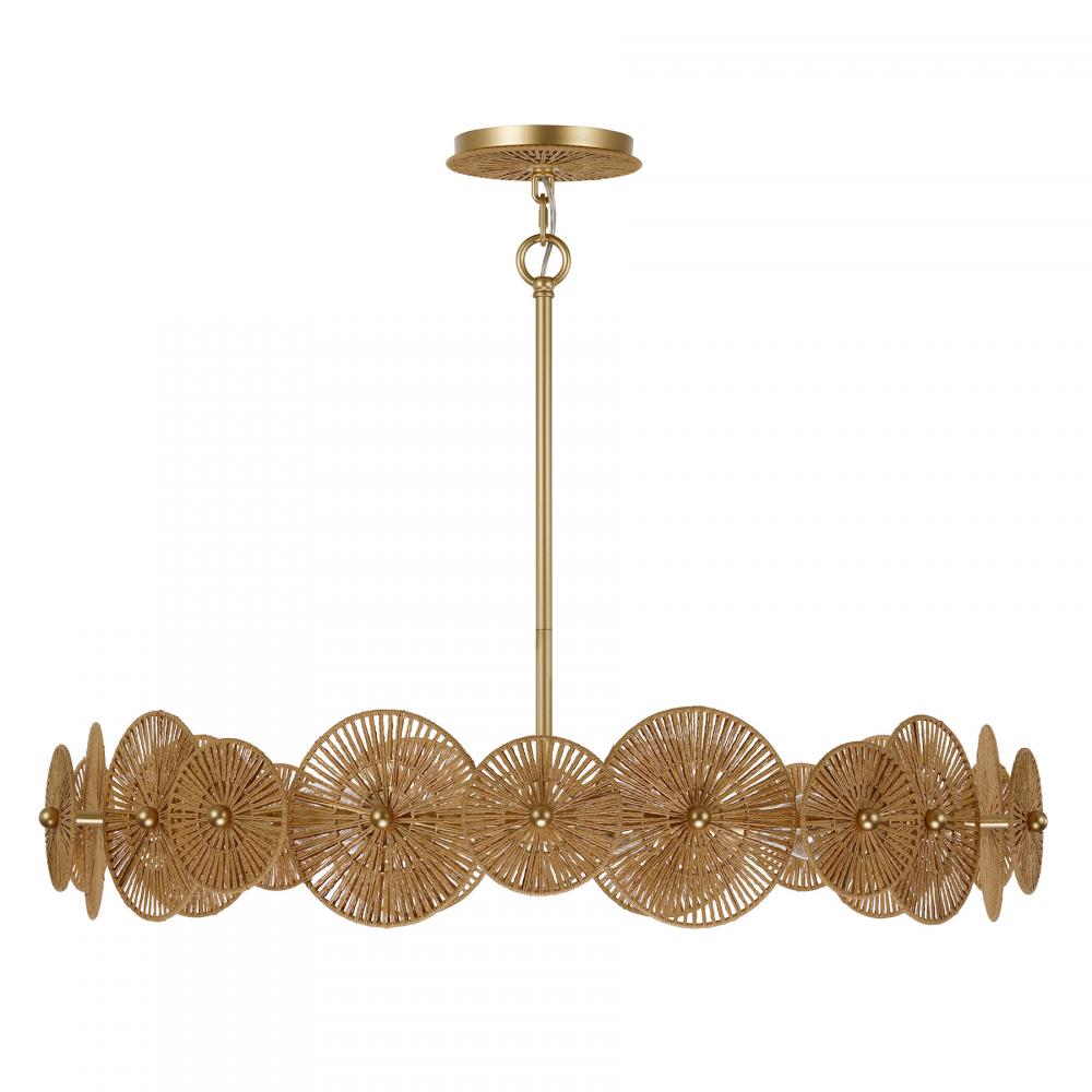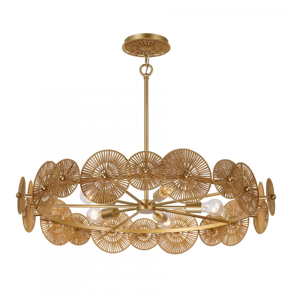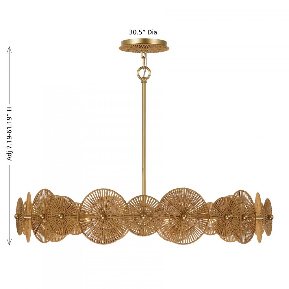 Showcasing intriguing organic style, the Savoy House Abbott 5-light pendant was designed by Breegan Jane, an award-winning interior designer and TV host. Breegan hails from California and infuses her designs with the laid-back, nature-inspired touches that are characteristic of the Golden State. Abbott holds spectacular eye-catching wheels of natural raffia that bring a big dose of touchable texture. It is finished by hand in Distressed Gold, adding extra glamour. Abbott is 30.5" in width and has an adjustable height ranging from 7.19" to 61.19". It uses five standard size bulbs of up to 60 watts per bulb. Bulbs not included. Comes with four 12" downrods and one 6" downrod.