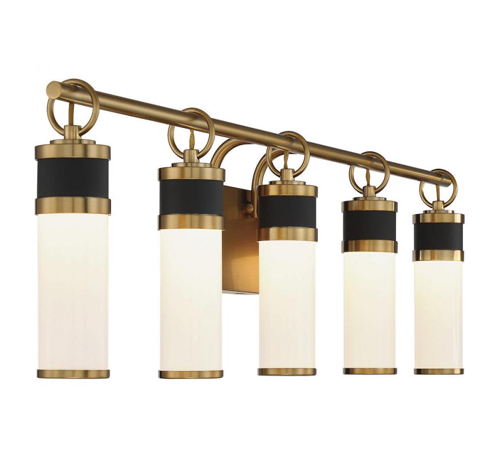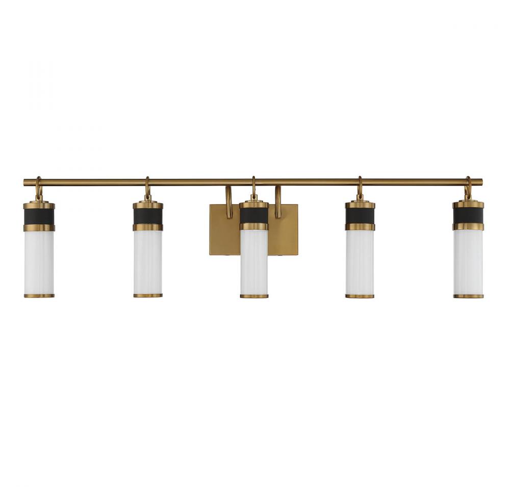 The Savoy House Abel 5-light bath vanity light flaunts a sleek and airy look that creates a robust presence in any space. Tubes of white opal glass are accentuated by ring accents and thoughtful hardware detailing in a rich combination of matte black with warm brass. Integrated LED light sources contribute to the sleek style. Abel is 10" in height, 39" in width and extends 5" from the wall. Damp area rated.