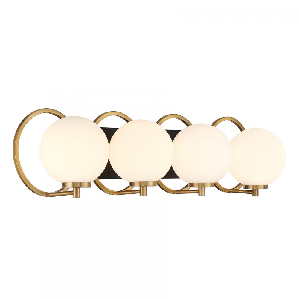 Art Deco style is reinvented in this chic Savoy House Alhambra 4-light bath bar. Orbs of soft frosted glass held on slender arms sit in front of a rectangular backplate accentuated by circles that frame the glass beautifully. A Matte Black and Warm Brass finish makes the perfect pairing. This bath bar is 7.75" in height, 32.5" in width and extends 7" from the wall. Uses four candelabra size bulbs of up to 60 watts per bulb. Bulbs not included. This bath light is damp area rated and must be installed as shown.